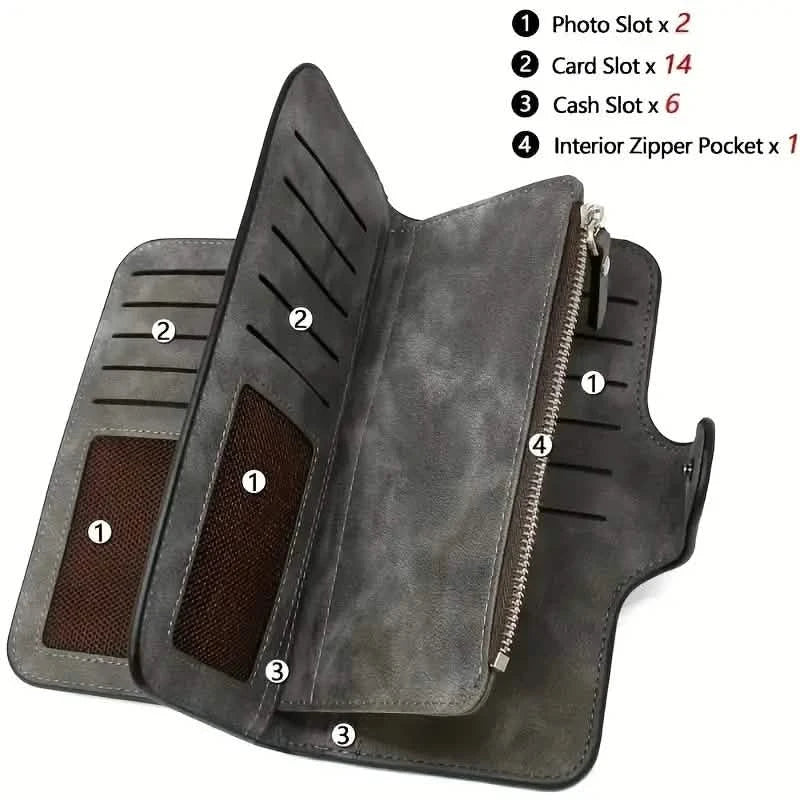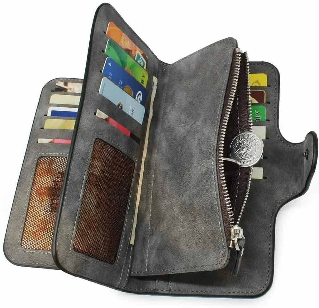 Vintage Faux Leather Long Wallet – Trifold Credit Card Holder with Snap & Zipper