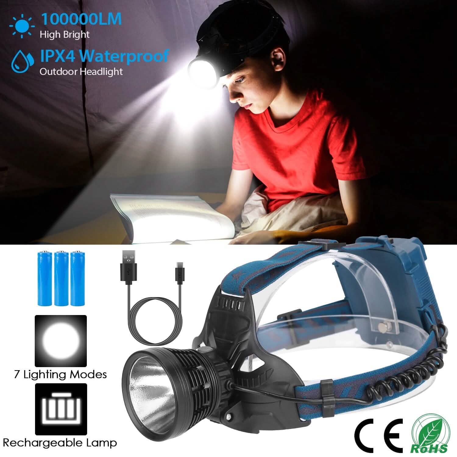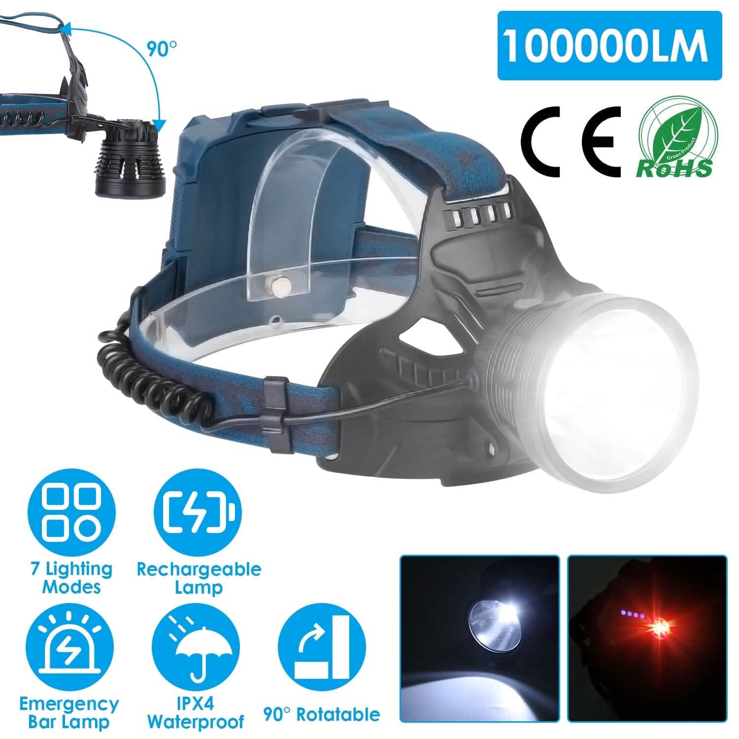 Upgraded P70 bead provide 100000lm super bright light. 7 Lighting modes meet your different lighting demands. Red safety taillight on the back of the battery bin can be a reminder in the ride or run at night, to provide a safer environment. Hands-free LED flashlight is very comfortable to wear and the lamp head can turn 90° down is very convenient to use, great for outdoor rescuing, hiking, hunting, camping, mountaineering, fishing, night reading, night working, emergency, etc..