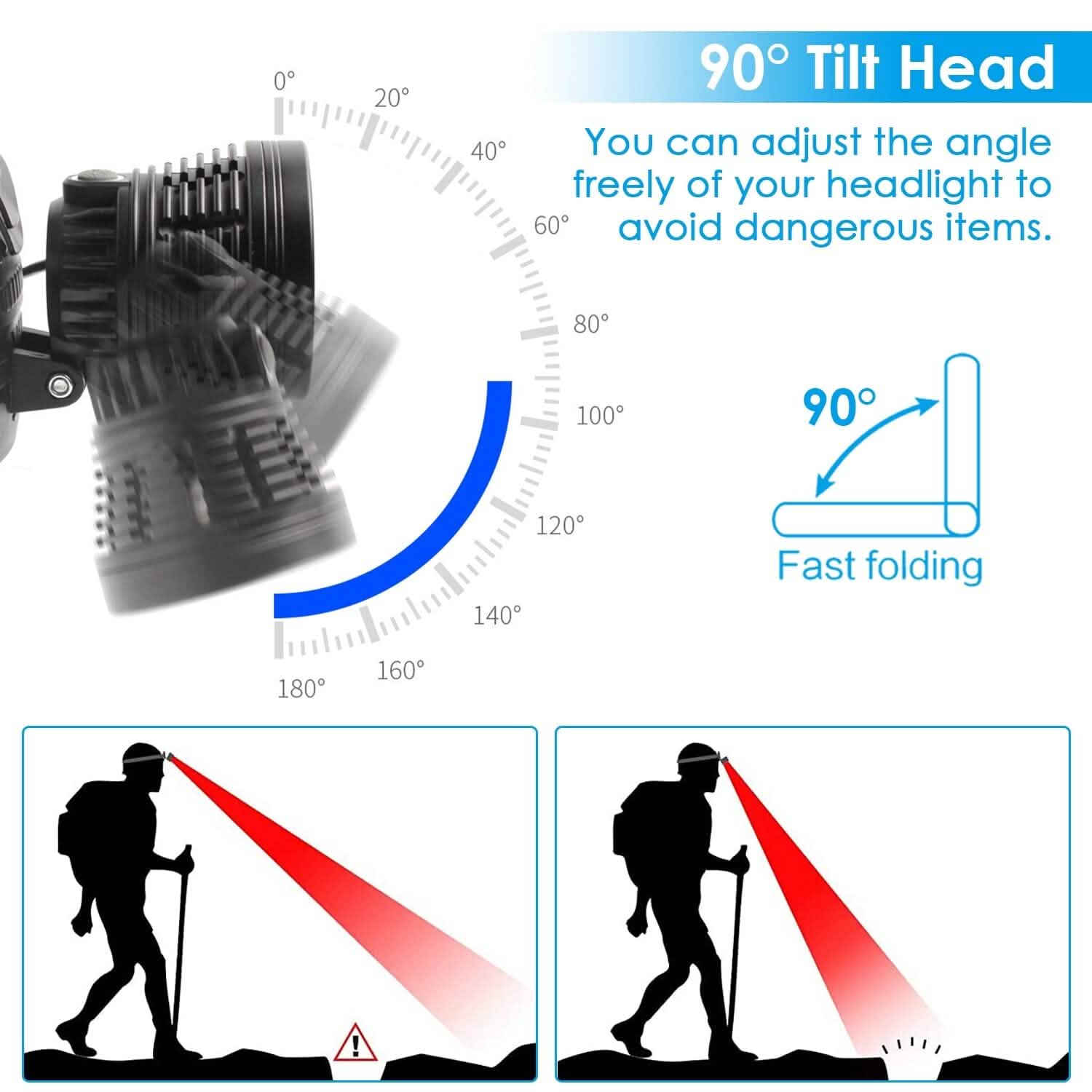 - IPX4 Waterproof & 90 Degrees Adjustable: With IPX4 waterproof rating, our hands-free headlamp flashlight can be used in rainy and snowy days. The lamp head can be rotated 90 degrees and tightly fixed to avoid shaking. It comes with elastic band and buckle for easy adjustment and installation, suits for people of different head circumference.
