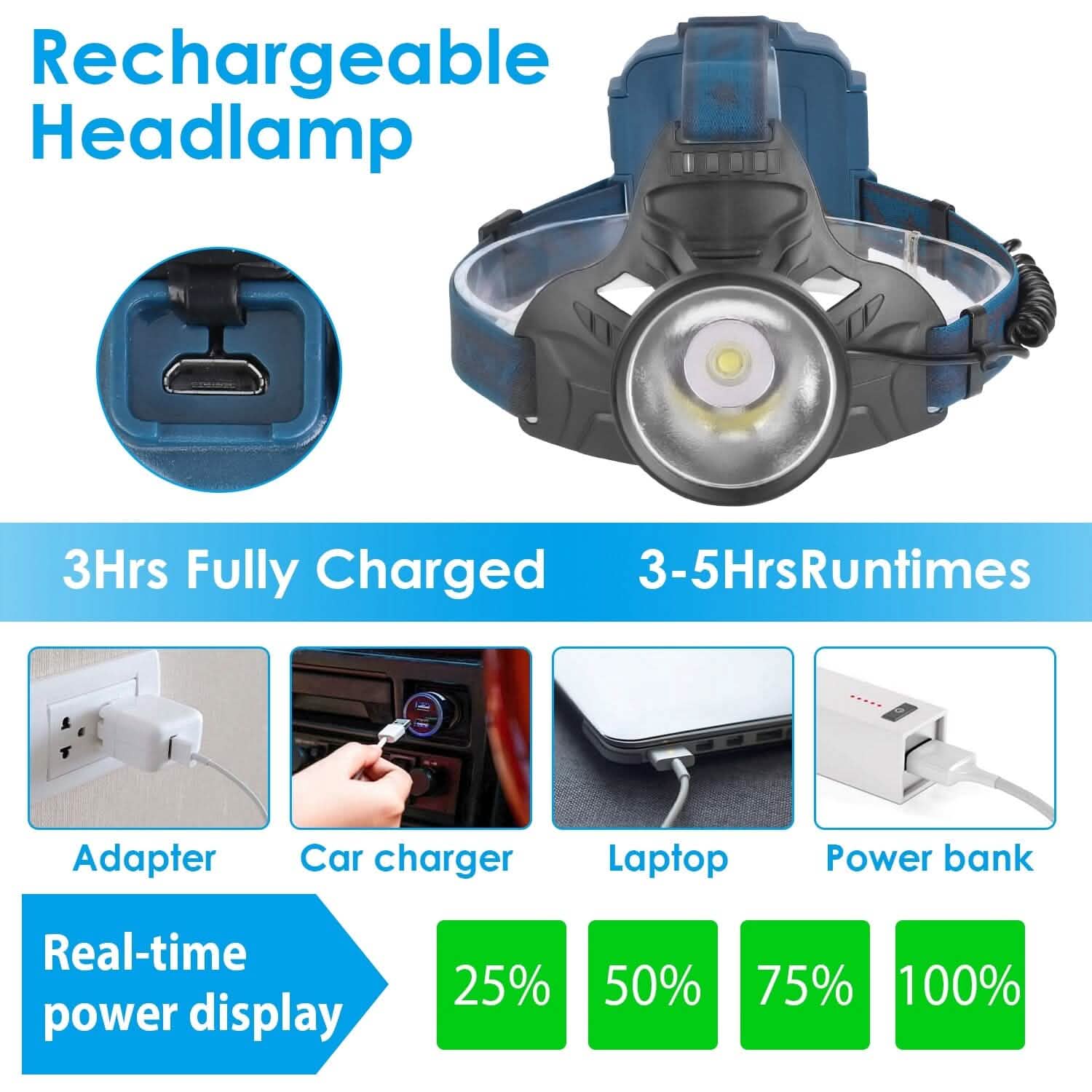 - Rechargeable Headlamp: The headlight comes with micro USB cable and built-in 6600mah overall rechargeable battery to provide a longer life. And it will last for 3-5hours (depends on lighting modes) when fully charged.