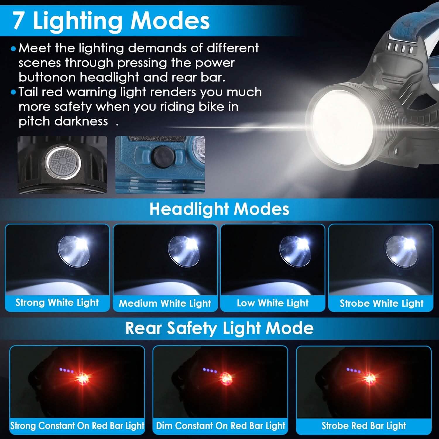 - 7 Lighting Modes: Press the power button on headlight and power button on the safety bar, 7 lighting modes will meet your different scenarios. (Strong White Light; Medium White Light; Low White Light; Strobe White Light; Strong Constant On Red Bar Light, Dim Constant On Red Bar Light; Strobe Red Bar Light).