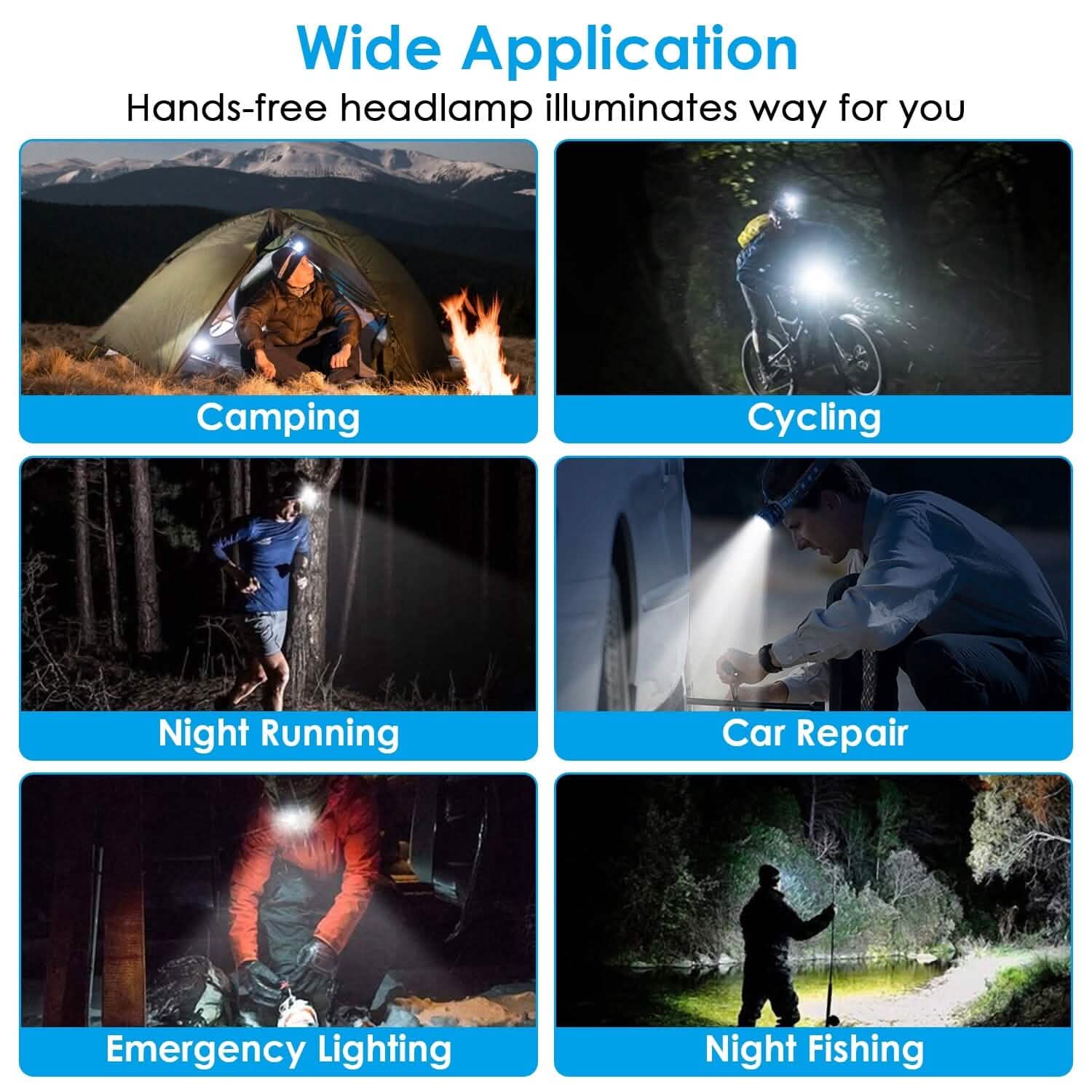 - Wide Applications: Suitable for rain or snow, indoors or outdoors. The headlamp is a perfect addition to your outdoor activities, such as running, camping, fishing, hiking, backpacking, hunting or cycling gear. 0.74lbs in weight will render you less burden in outdoor activities or power outage.