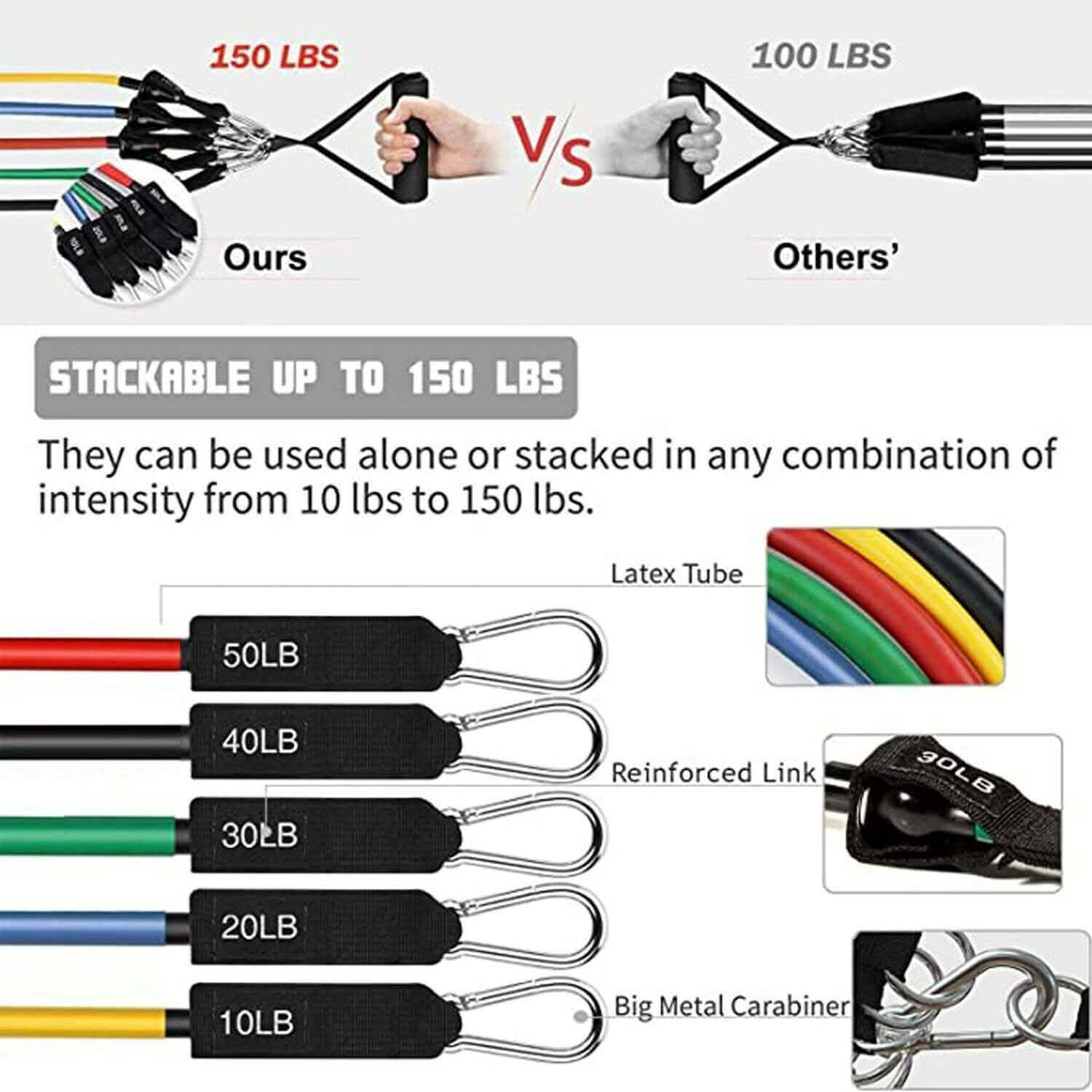 - Different Color Adjustable Resistant Bands: Yellow (10 lbs.), Blue (20 lbs.), Green (30 lbs.) Black (40 lbs.), Red (50 lbs.). All exercise bands are 43" in length, and can be used alone stacked in any combination to a maximum equivalent of 150 lbs.