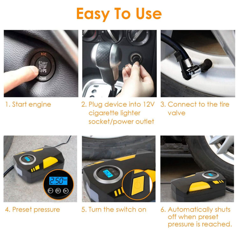- Easy To Use&Auto Shut Off: First, start the car. Insert the cigarette plug into the socket and connect the inflation nozzle to the tire. Finally set the pressure and switch it on to start inflating. It will automatically power off after reaching the set value.