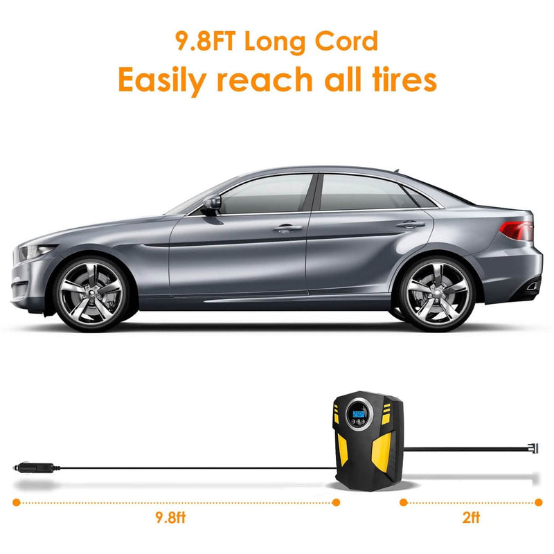 What people may not realize is that a tire inflator can be a life saver. If you’re stranded in the middle of a snow storm and have a flat tire with no way to call for help, this 12v portable air compressor can inflate that tire and get you back on your way within minutes. You can set the pressure value manually between 0-150PSI and it will stop working automatically after reaching the set value. The 9.8ft charging cord can easily reach all tires easily. It’s not limited to car tire inflation, but also applied to bicycles, motorbikes, pools, balls, and so on.