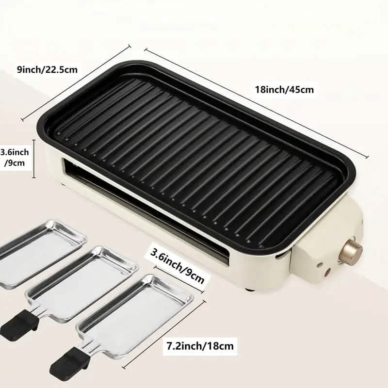 - Features a non-stick surface that helps keep food from adhering and simplifies the cleaning process. Its elevated ridges help to trap excess grease, resulting in a healthier and tastier barbecue experience. Furthermore, it comes with three small raclette pans specifically made for melting cheese. You can grill on the non-stick plate at the same time, which saves time and guarantees tasty outcomes.