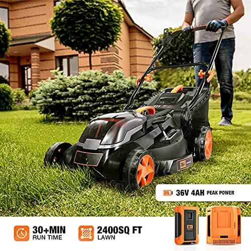 - HIGH PERFORMANCE BATTERY: This battery lawn mower is equipped with a 40V Max (36V Rated) 4.0Ah battery and a charger, providing a long lasting performance and durability. Fully charged in 150 minutes, run for 30+ mins minutes under no-load, provides a continuous mowing up to 2400sq ft and actual run time depends on the condition of the grass. We sell replaceable batteries to meet your more needs, please see the description for details.