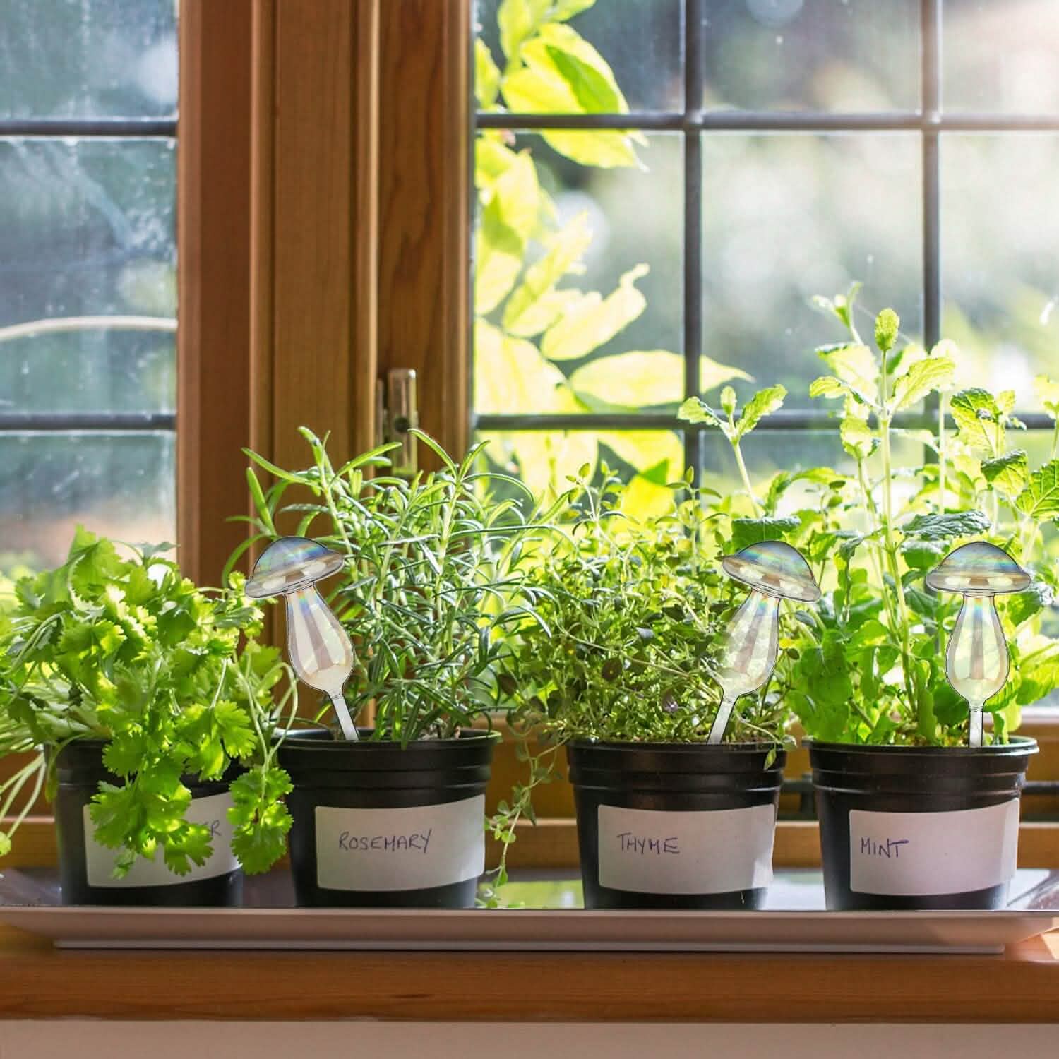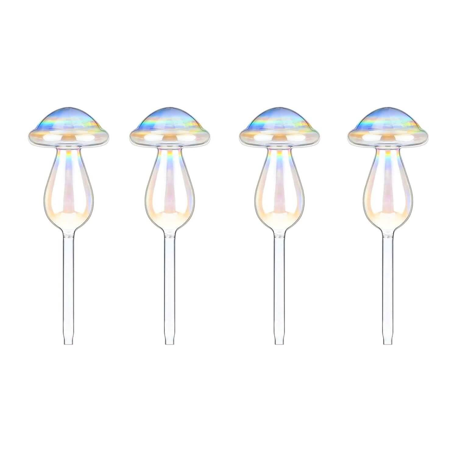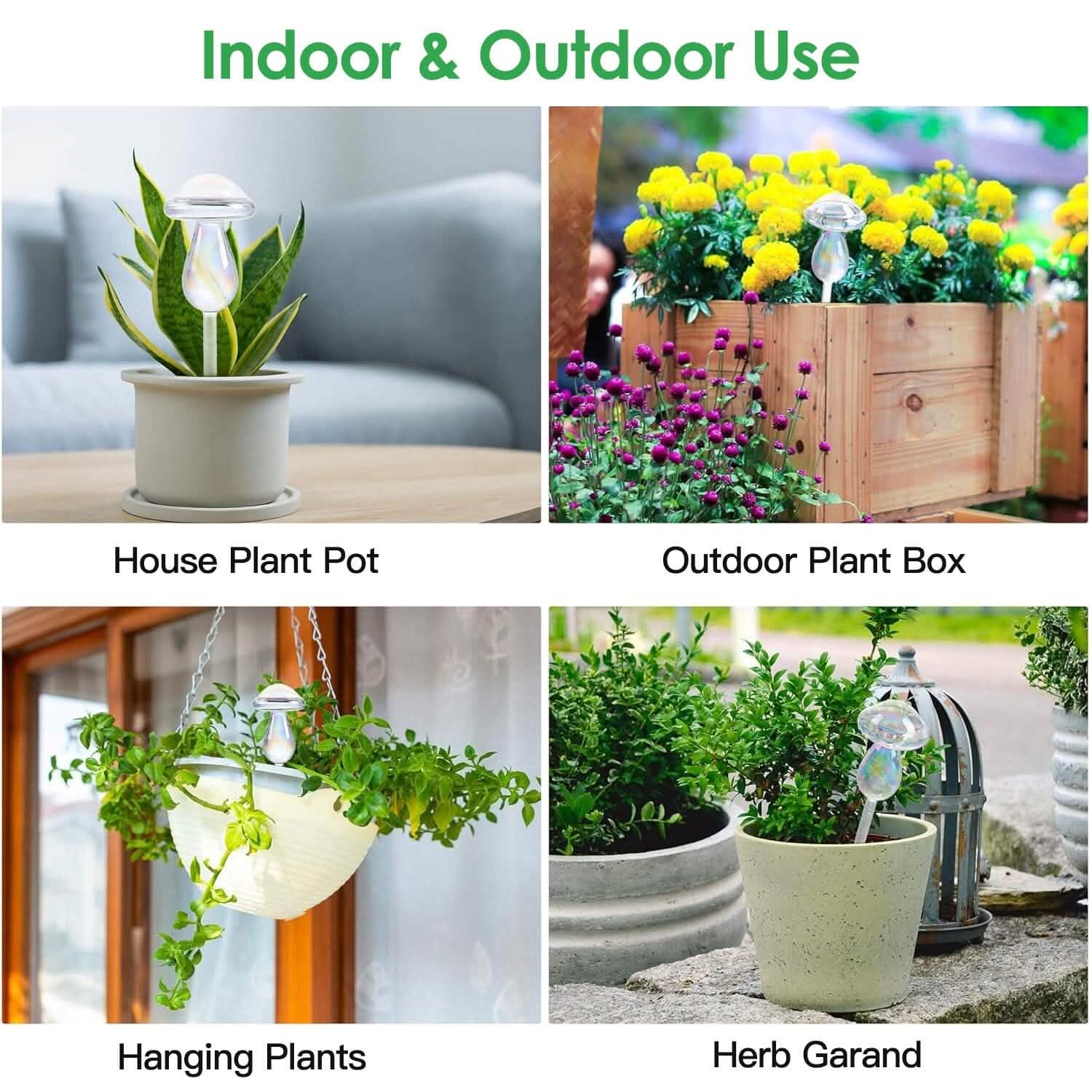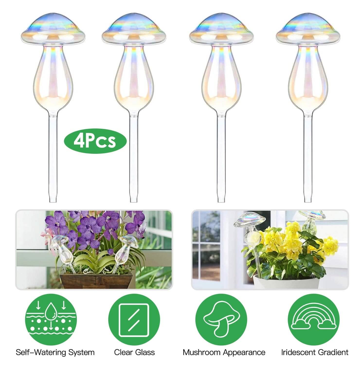 Our 4Pcs plant self-watering globes made of high quality clear glass, can contain about 120m/4oz water to help your plants and flowers to maintain moisture for about 5-7days while you are out of travel or business trip. Moreover, these plant watering containers with lovely mushroom shape will glow up iridescent rainbow gradient under sunshine or light, adding fairy and romantic atmosphere. Durable material and attractive appearance make the watering globes as ideal irrigation tools and eye-catching decoration for both indoor and outdoor plants.