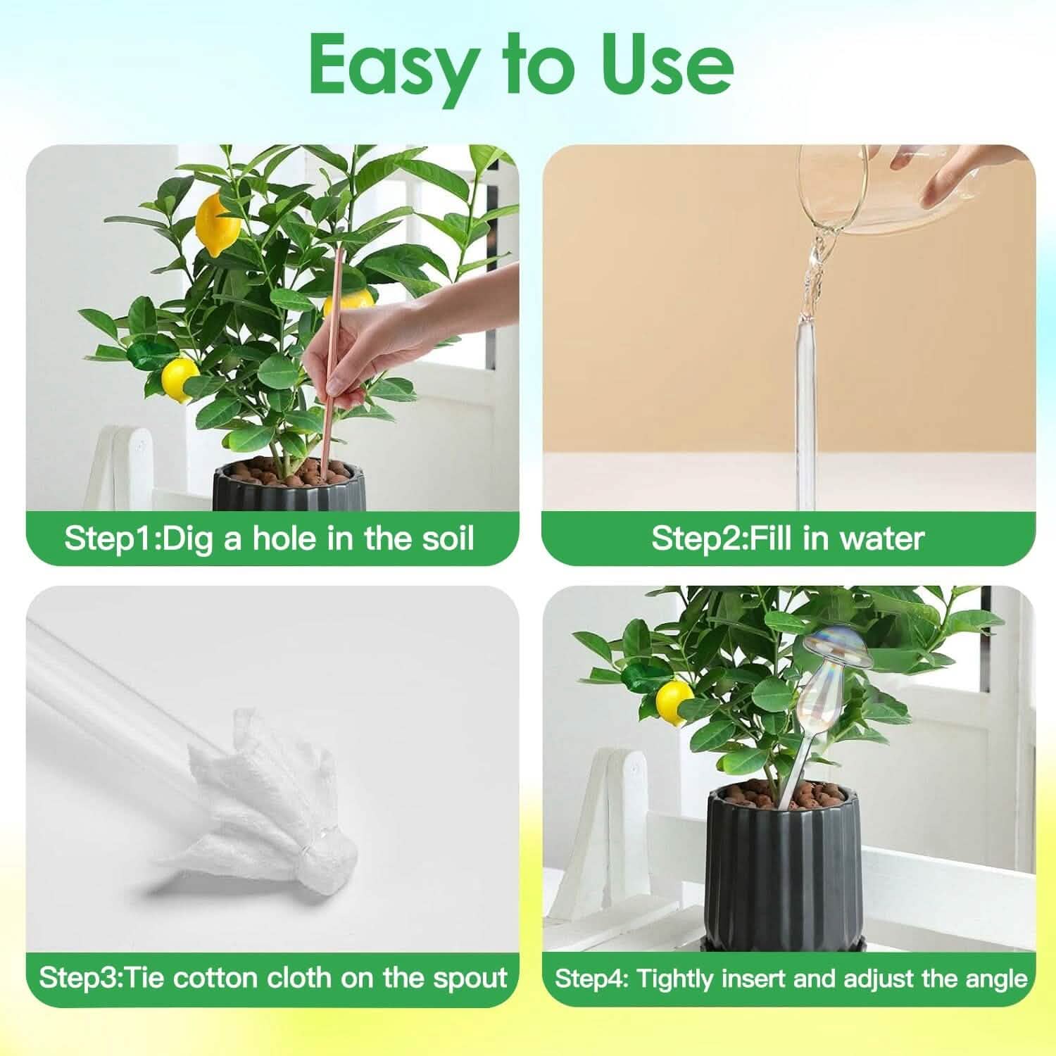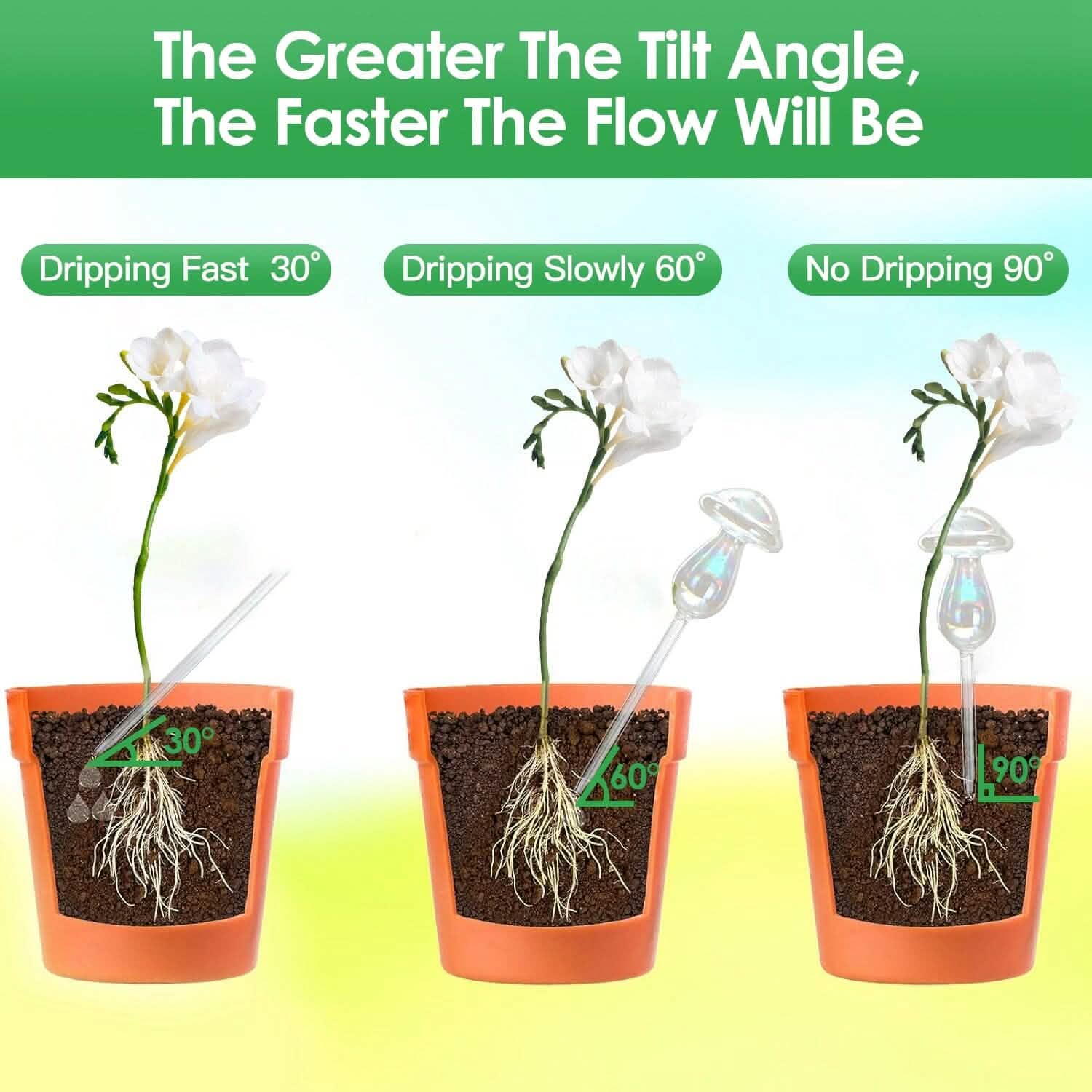 - Easy To Use: Installed without any tools, just fill the globe and wrap the spout with cloth, then dig a hole in the soil and gently insert our self-watering container into the soil, adjust to your desired angle. Different angles lead to diverse dripping speeds, the greater the tilt angle, the faster the flow will be.