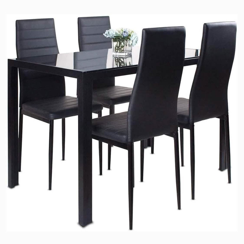The 5 Piece Dining Set features a sleek glass tabletop sitting on a sturdy steel frame and four matching dining chairs. With an ultra-modern appearance, the set situates itself at the heart of your dining space with unmatched aesthetics and thoughtfully-designed details. The 8mm tempered glass provides supreme durability and creates a stunning light effect. Chairs are perfectly padded to give muscle-supporting comfort. All feet are capped to keep the floor from scratching. The 5 Piece Dining Set stands out with contemporary appeal. It is simple but stylish and captures the radiant warmth of a family dining space.