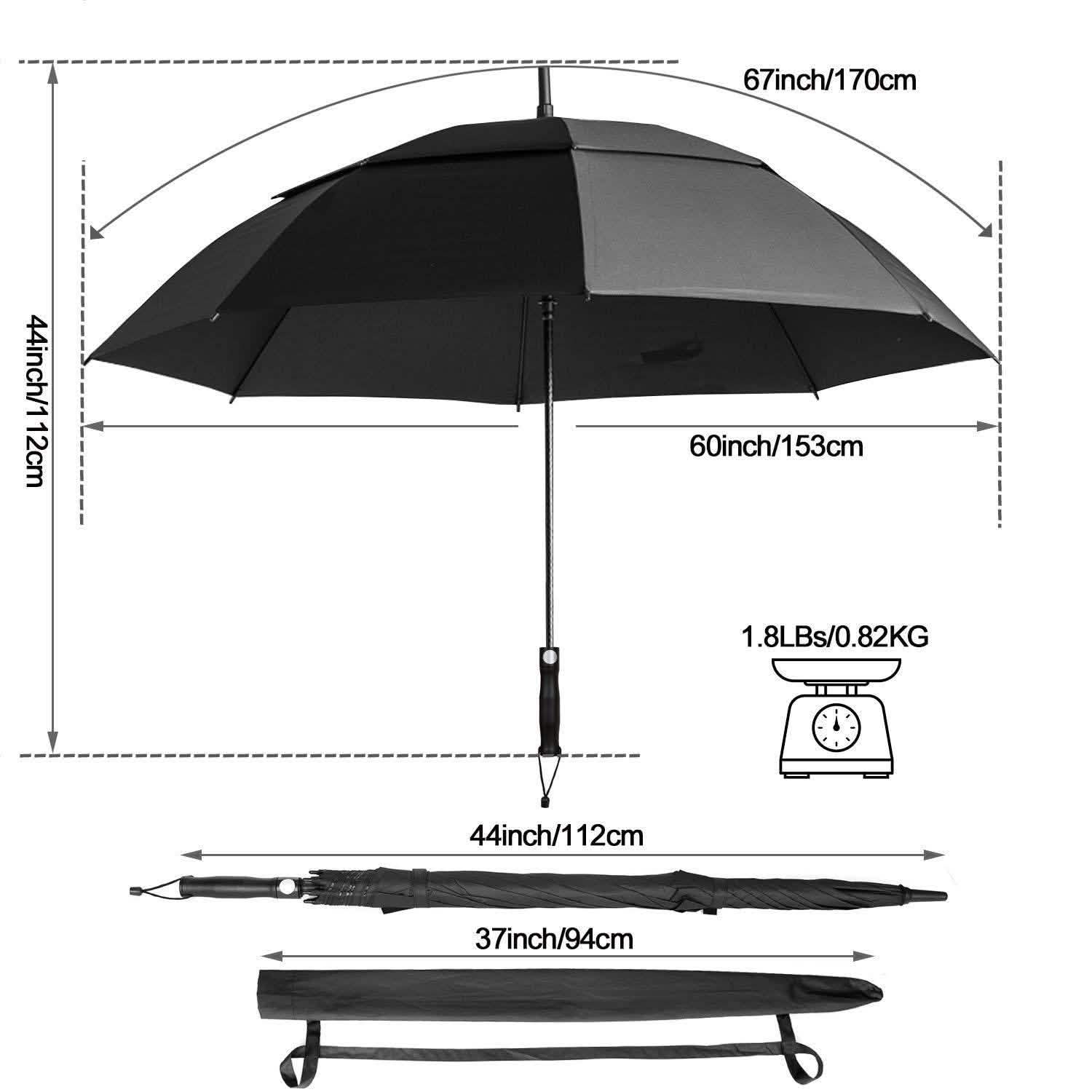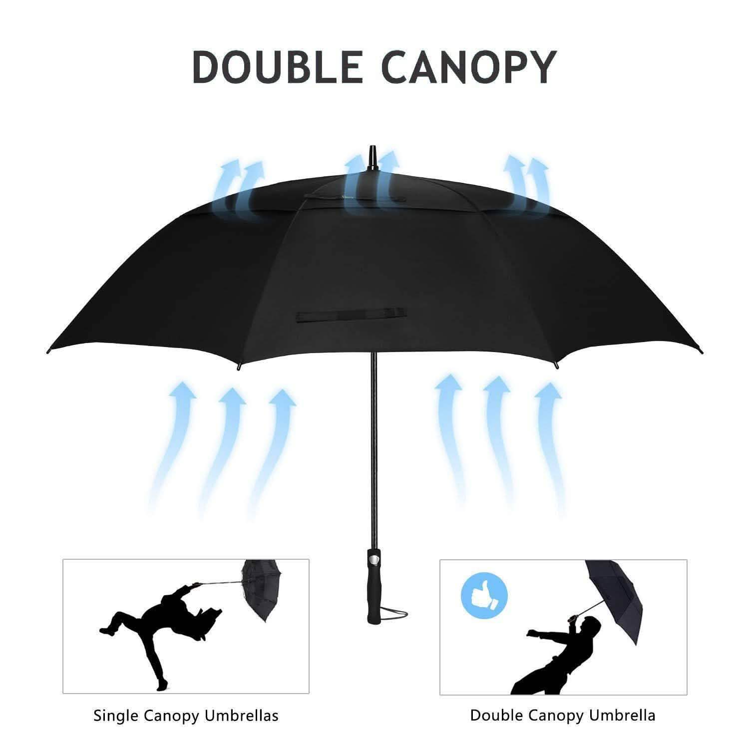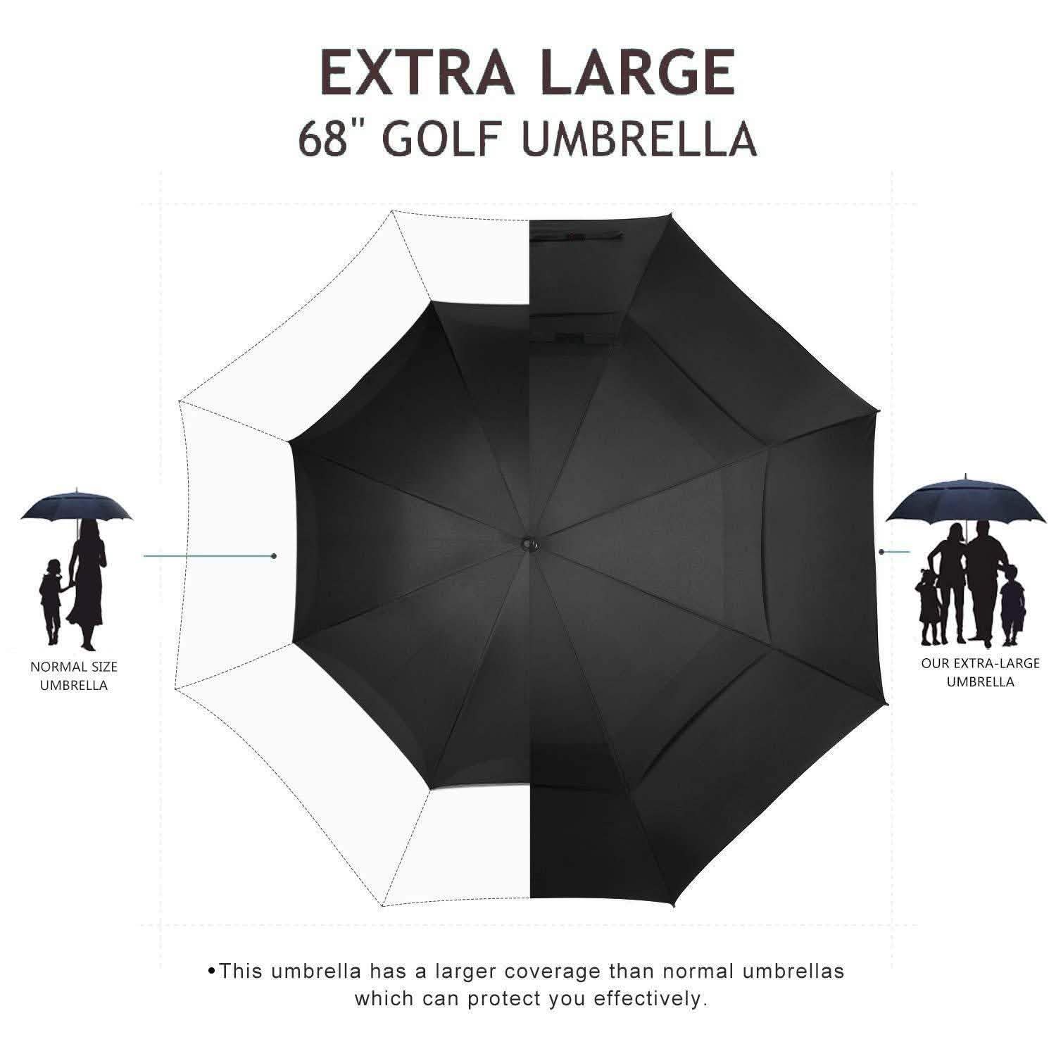 - This Golf Umbrella: With a 68-inch oversize canopy and heavy duty design is an ideal companion for golfers, the business professional or for daily life. This automatic open golf umbrella with a vented double canopy. With eight folding frames of umbrella in all fiber and 68 inches size, it can well withstand work and weather conditions, especially under wind or rain situations. Therefore, there is no need to be anxious that the umbrella will be blown inside out and a large area can be covered.
