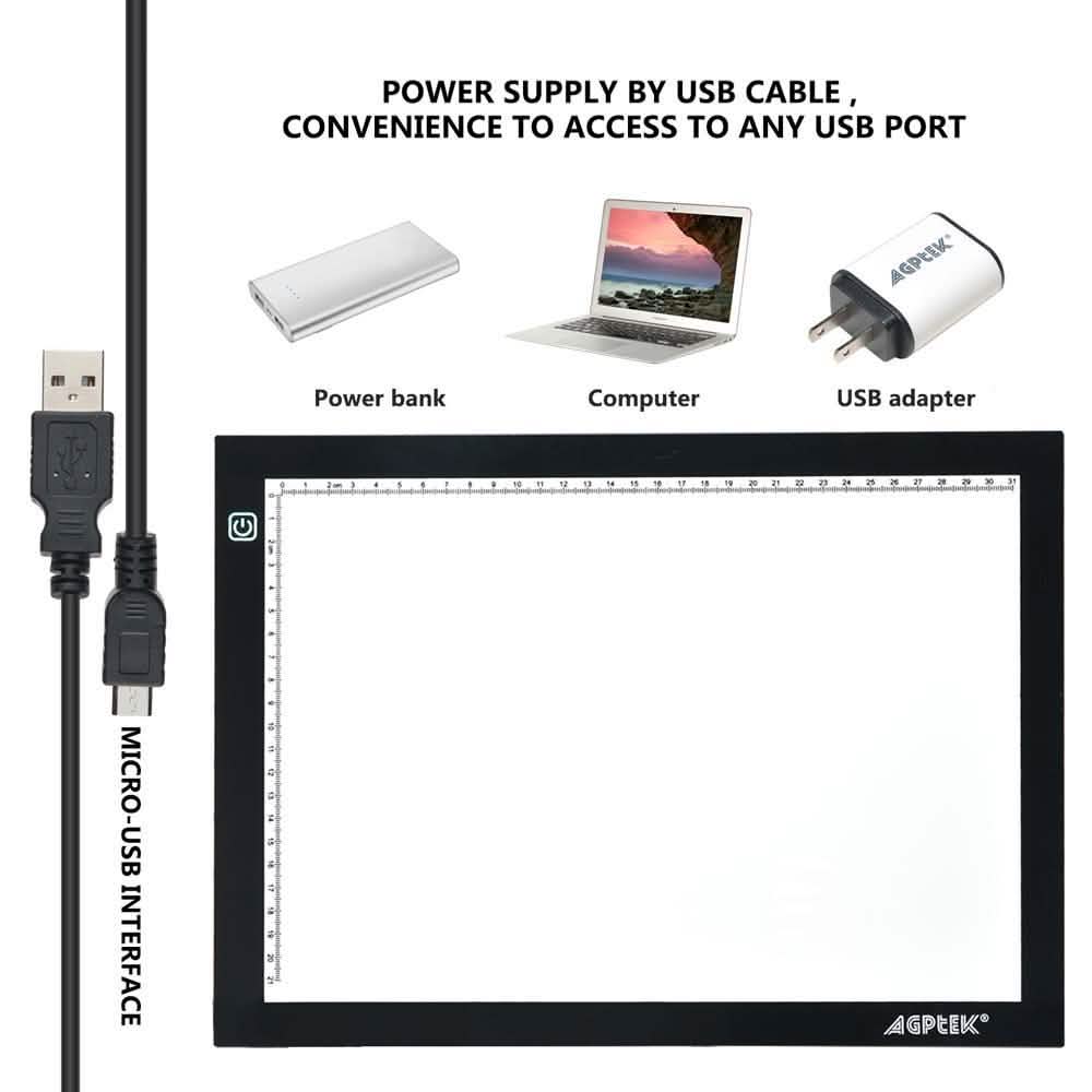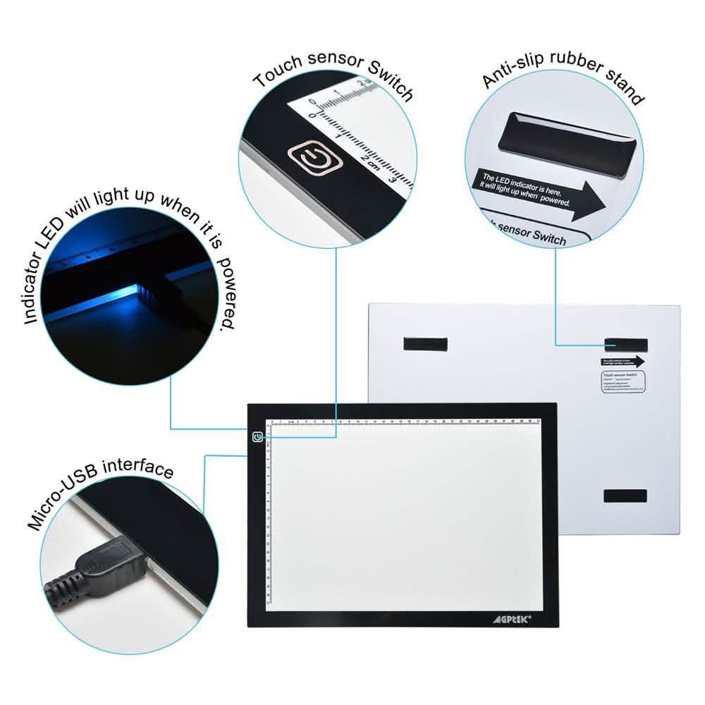 This Artcraft tracing light pad is a sleek light-up pad, the light from the pad through the paper clearly illuminates the images, which makes tracing images become easy. Power supply by USB cable which means easy to access to any USB port like computer, USB adapter or even power bank, besides, it is ultra-thin and lightweight design, thus you can take it anywhere. Equip with touch sensor allow the control become easier, no matter turn on/off or adjust the brightness, simply handle with a slight touch. It is perfect for multiple domains, such as 2D Animation, Calligraphy, Embossing, Scrapbooking, Tattoo Transferring, Sketching & Drawing, Sewing projects, Stained Glass, Quilting, etc.