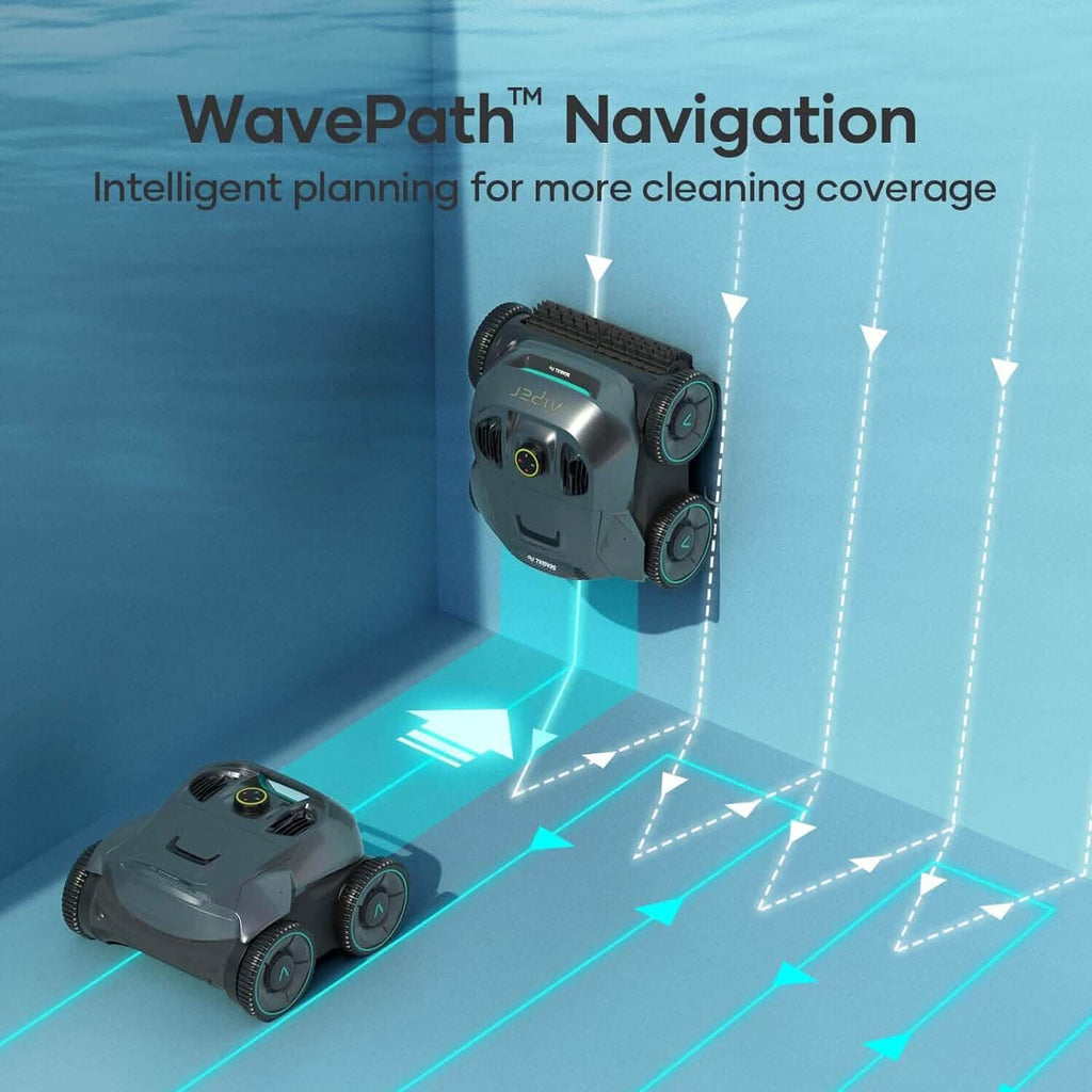 - 10X More Cleaning & Energy Efficient: WavePath Navigation allows the pool vacuum to work under fixed pattern rather than traditional random pattern. More pool coverage, less energy. The cordless design means no tangled cords and no messy or complicated accessories. Simply drop the pool vacuum in the pool and take back your free time while Aiper handles the cleaning.