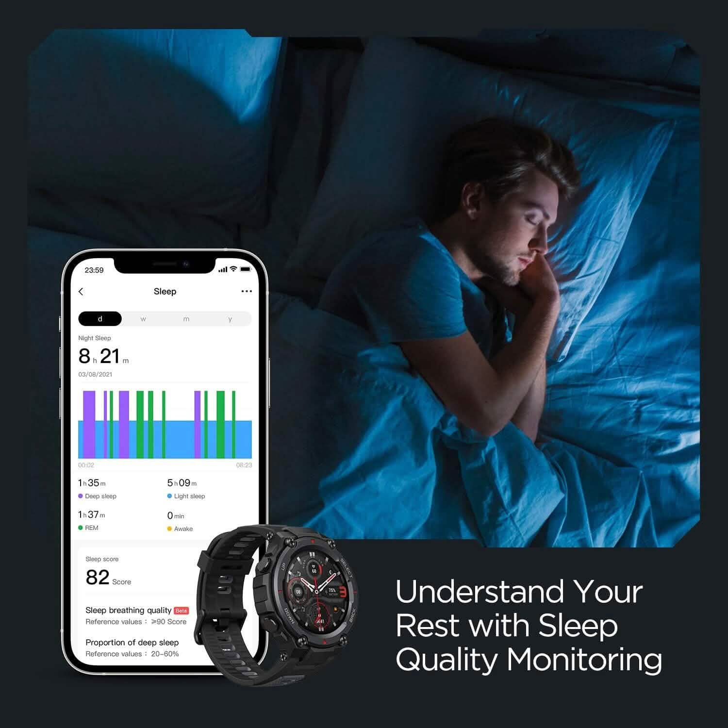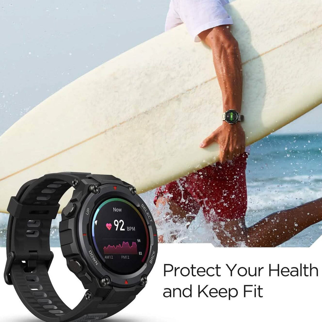 - Your Partner in Exploration: The Amazfit T-Rex Pro smartwatch is high-level exploration partner, supporting four global navigation satellite systems, a blood-oxygen saturation measurement system, a heart rate monitor, a sleep monitor, a weather tracker, a sunrise and sunset monitor, a current moon phase display, a compass and barometric altimeter.
