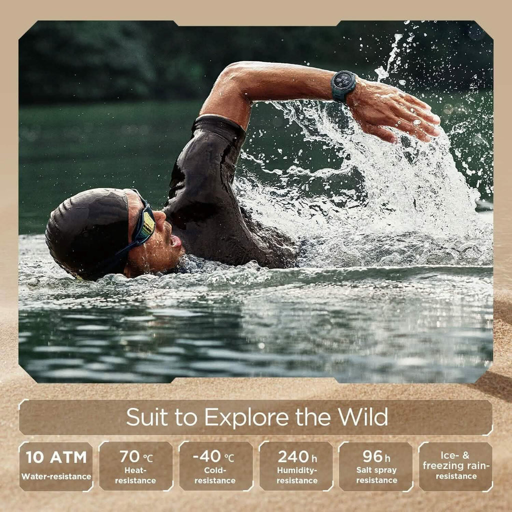 - 10 ATM Water Resistant: With a 10 ATM grade, the Amazfit T-Rex Pro smartwatch is water-resistant to a depth of up to 100 meters and can accompany you as you surf, swim, or explore the mysterious underwater world together.