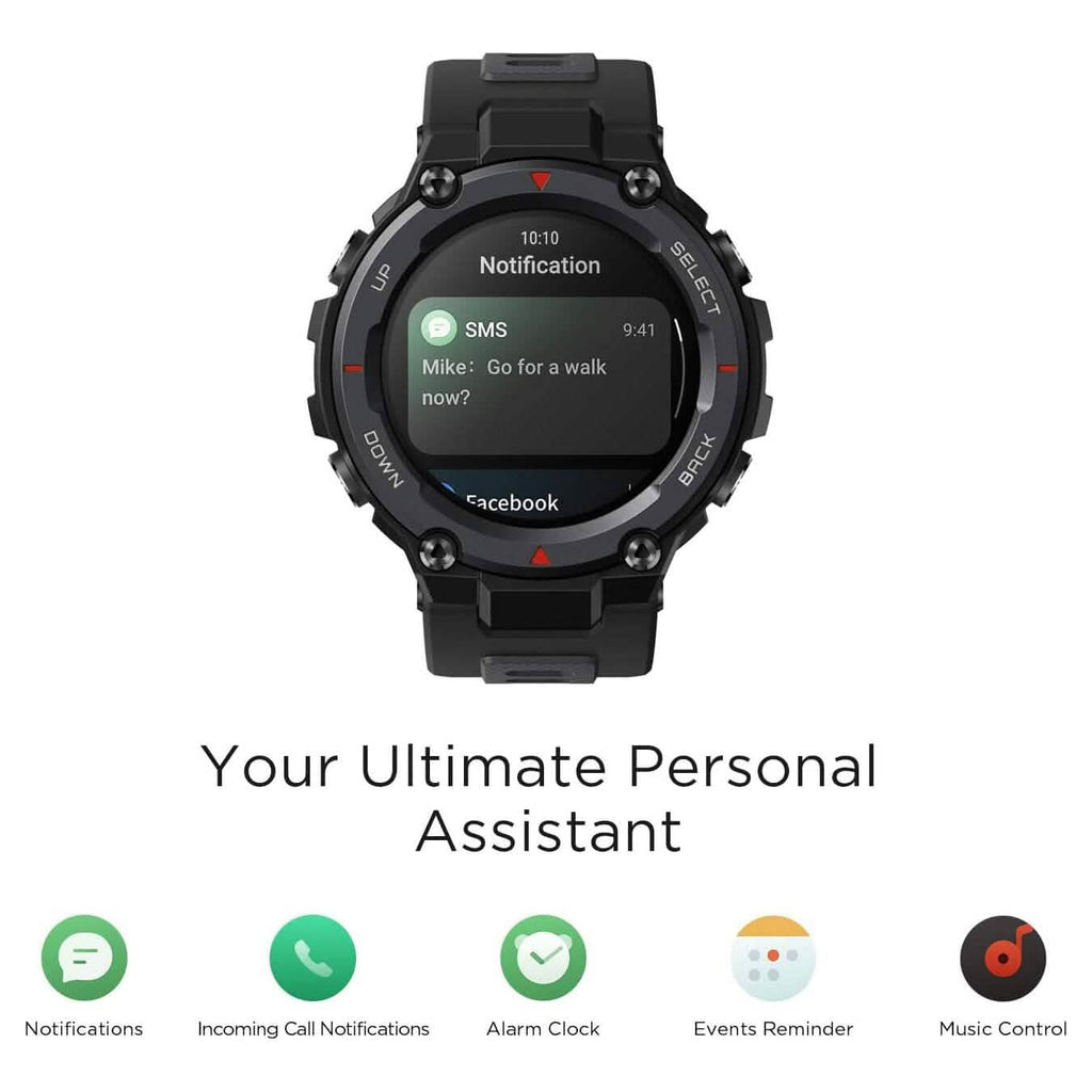 - Your Ultimate Personal Assistant: The Amazfit T-Rex Pro smart watch notifies you of any incoming text messages or calls, scheduled alarms, and events, to prevent you from missing any important information. It can also easily control music playback.