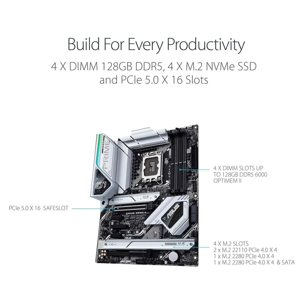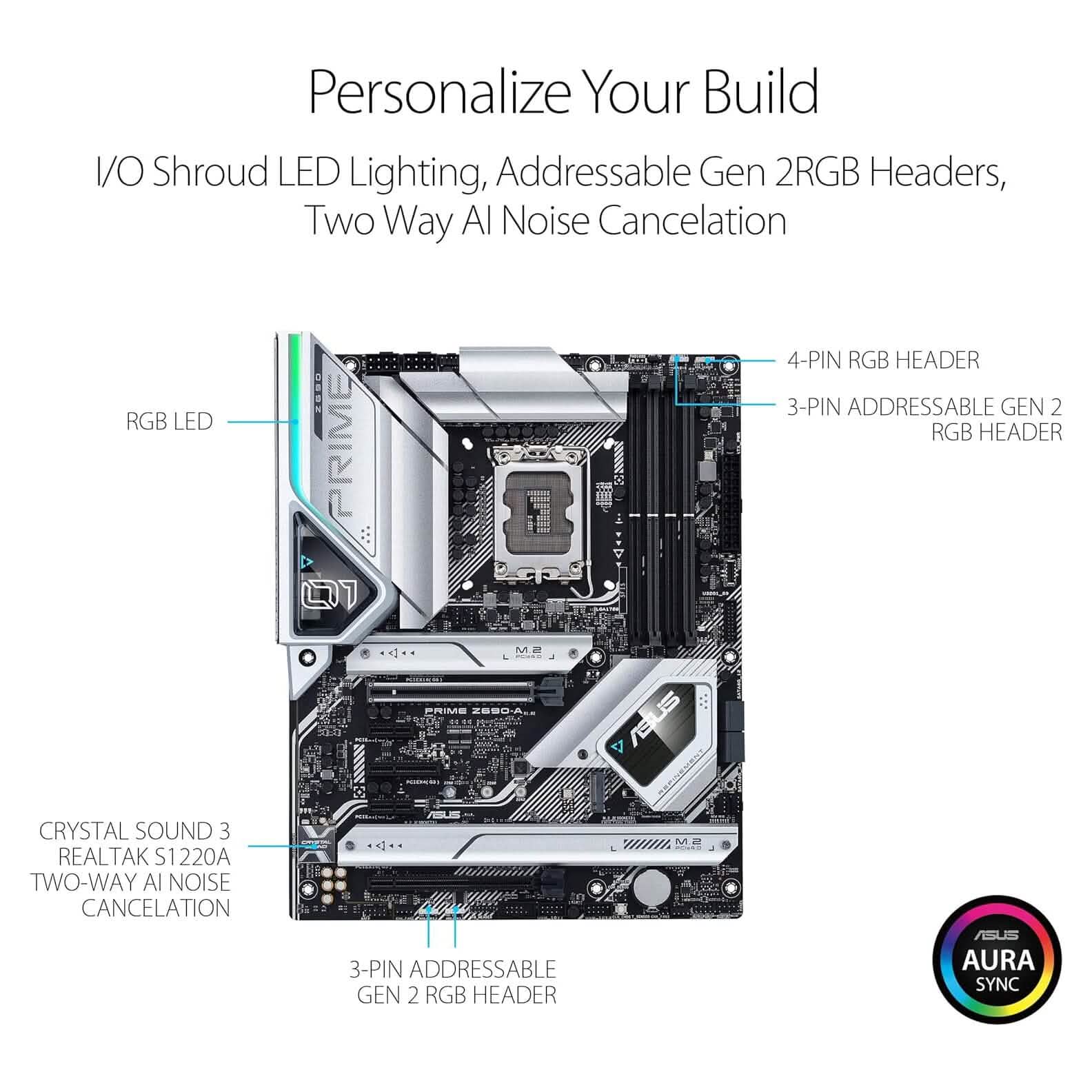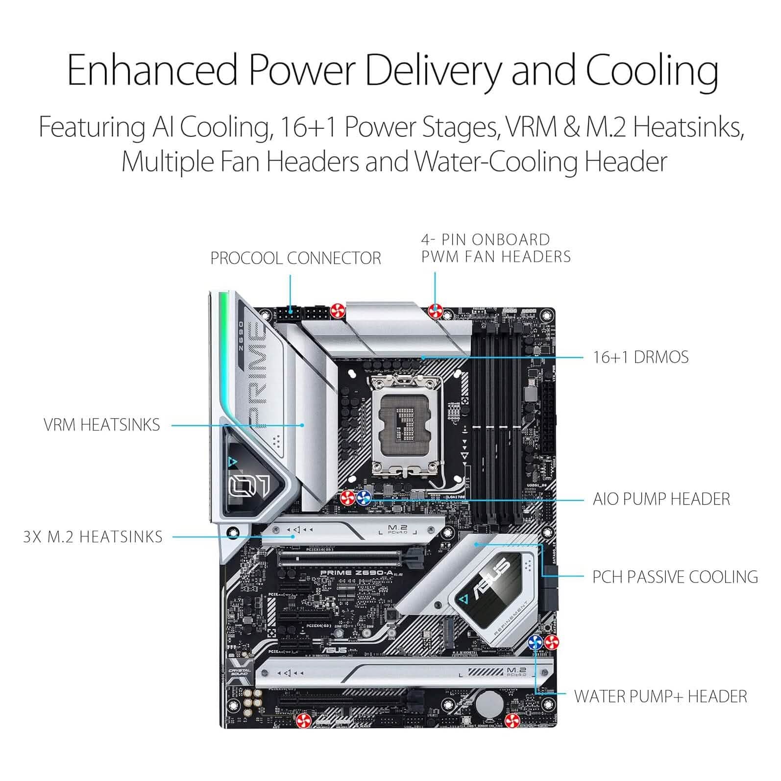The ASUS Prime Z690-A is expertly engineered to unleash the full potential of 12th Gen Intel Core processors. Boasting a robust power design, comprehensive cooling solutions and intelligent tuning options, the ASUS Prime Z690-A provides daily users and DIY PC builders a range of performance tuning options via intuitive software and firmware features.ASUS Prime Z690-A is perfect for those seeking to create a sleek, futuristic-looking build, thanks to its black and white finish and iridescent metallic nameplate and PCB cover.
