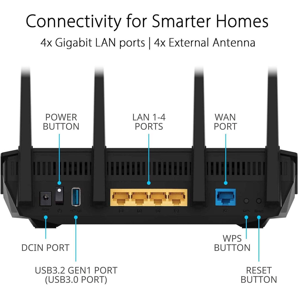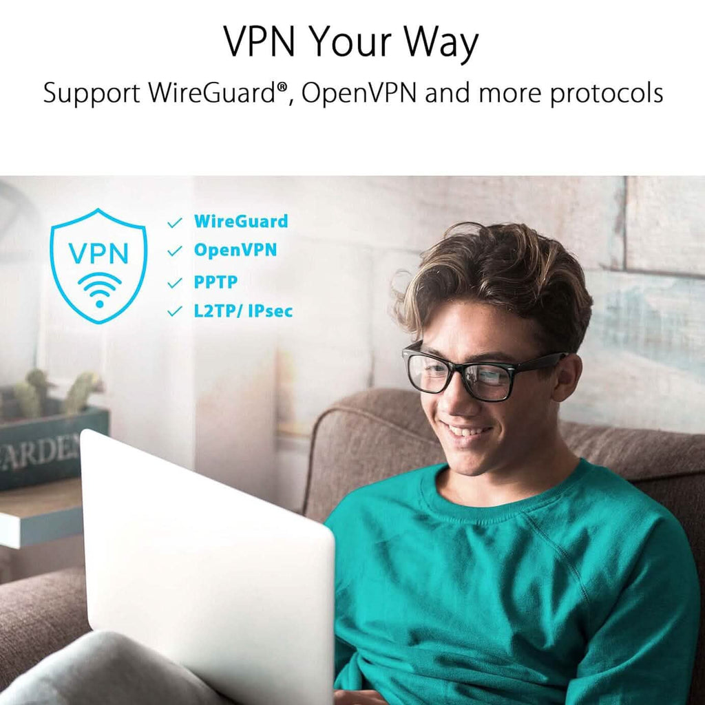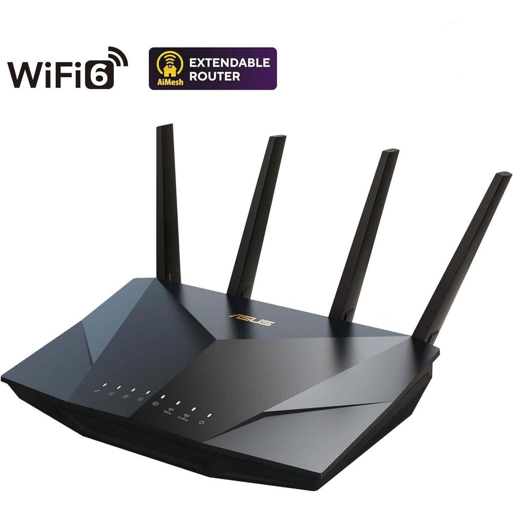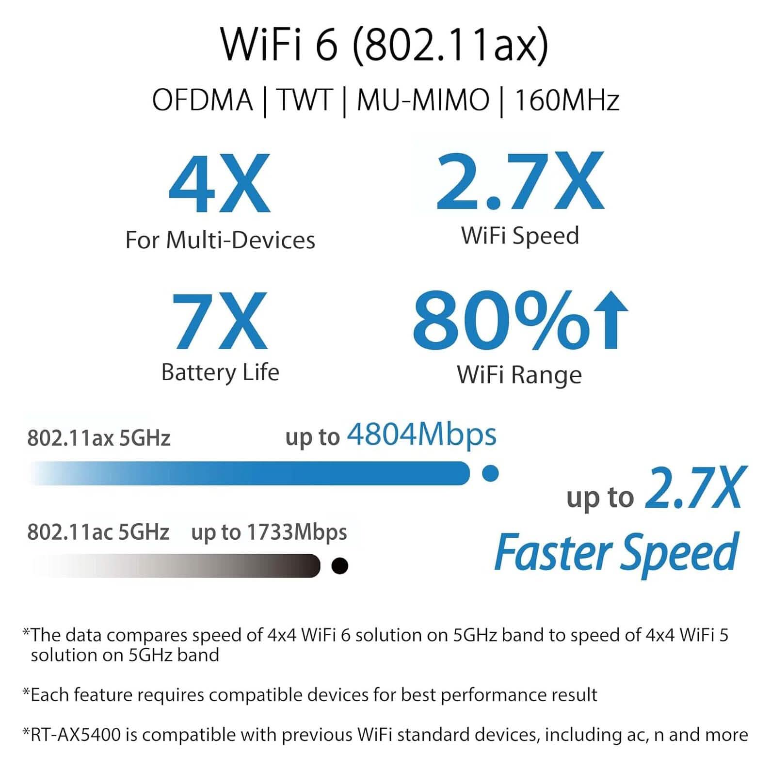 ASUS AX5400 Dual Band WiFi 6 (802.11ax) Extendable Router, Included built-in VPN, AiProtection Pro Network Security, Parental Control, Instant Guard, AiMesh-Compatible. RT-AX5400 leverages WiFi 6 to deliver faster and more stable internet to the growing multitude of smart devices in your home. The faster speed, higher network efficiency and capacity free you to connect as many devices as you need, while enjoying top WiFi speeds.