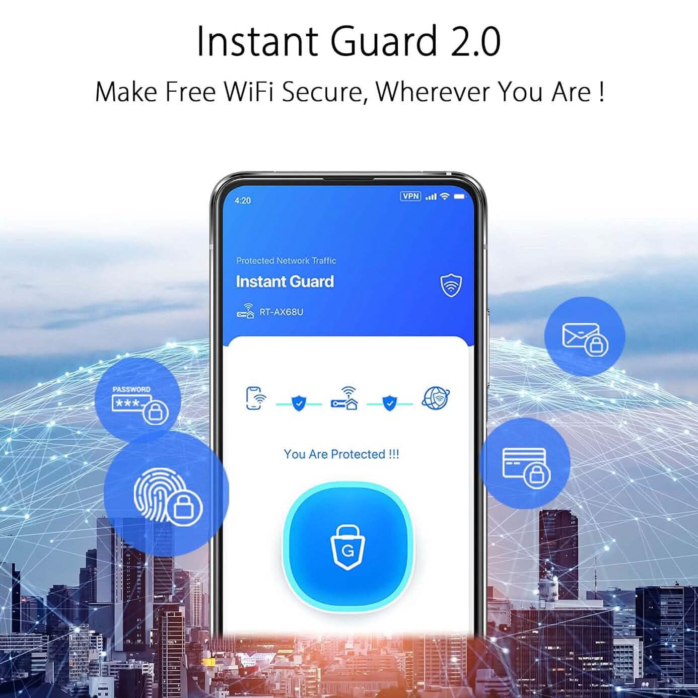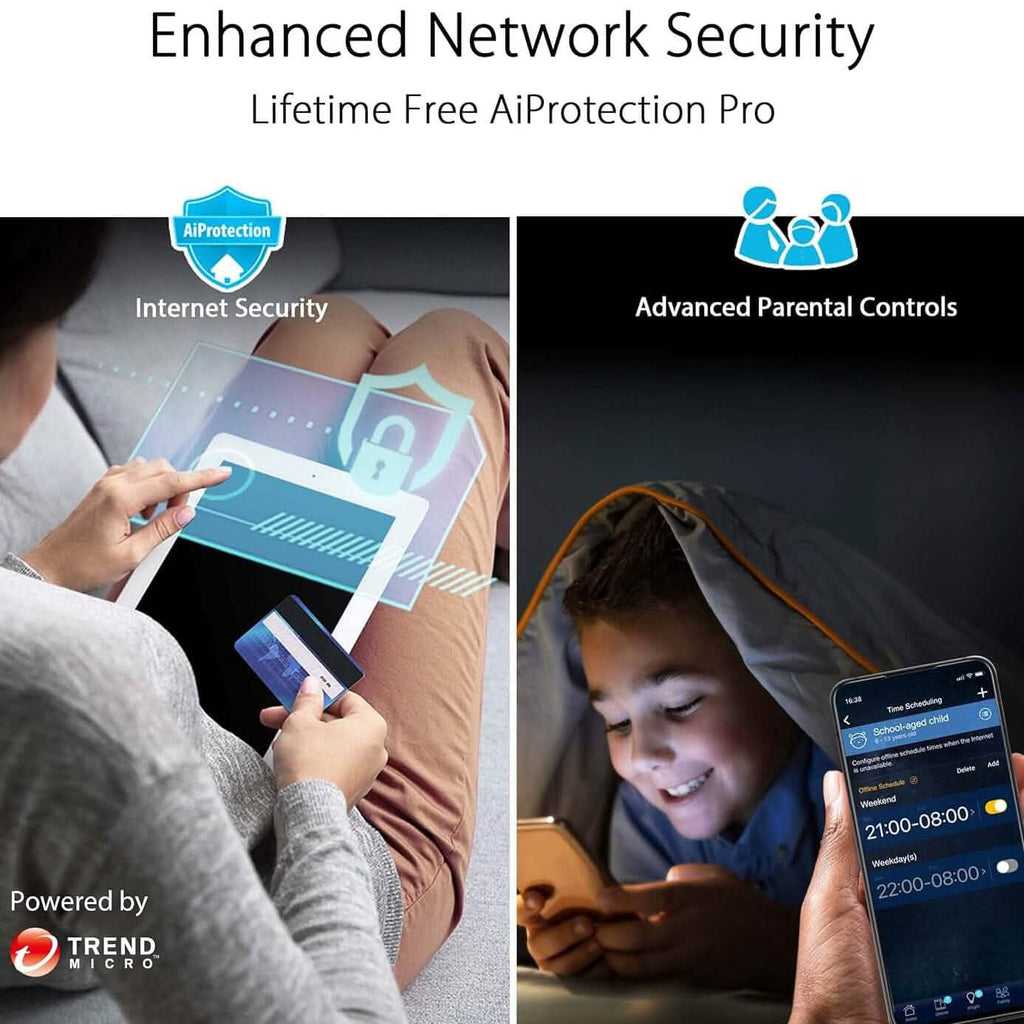 - Commercial-grade Security Anywhere – Protect your home network with AiProtection Pro, powered by Trend Micro. And when away from home, ASUS Instant Guard gives you a one-click sharable secure VPN.