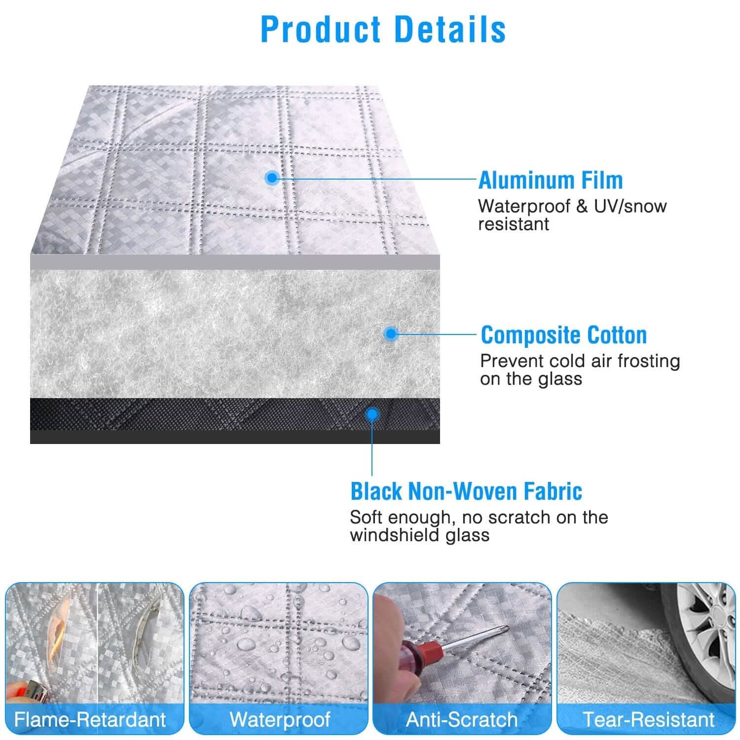 - Advanced Material: Made of sturdy and durable aluminum film, non-woven fabric and fire-retardant filled cotton, the snow cover is waterproof, windproof, frost-proof, ice free, and anti-UV, which can effectively protect your car in extreme weather.
