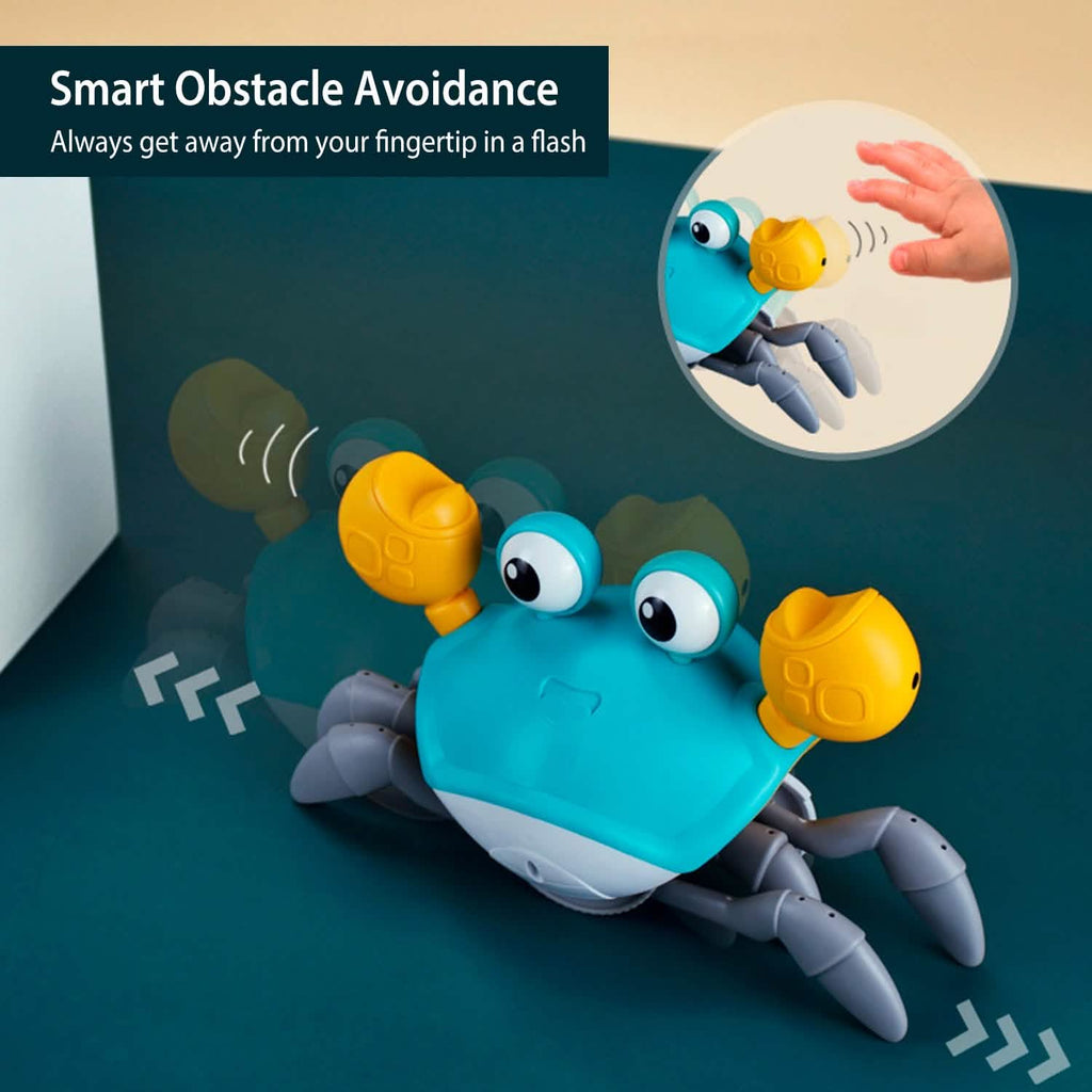 Sensing Technology: Equipped with an advanced sensor, the crab detects obstacles and automatically changes direction, promoting safe and independent crawling. This interactive movement encourages your baby's motor skills and hand-eye coordination.