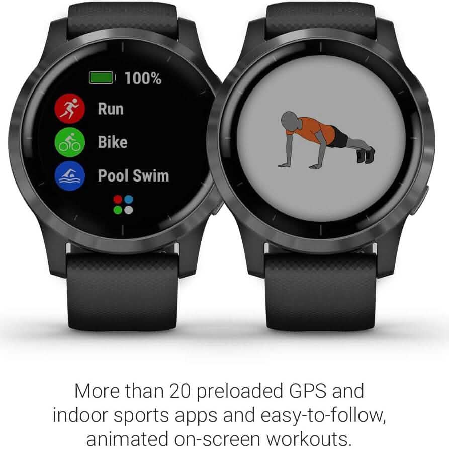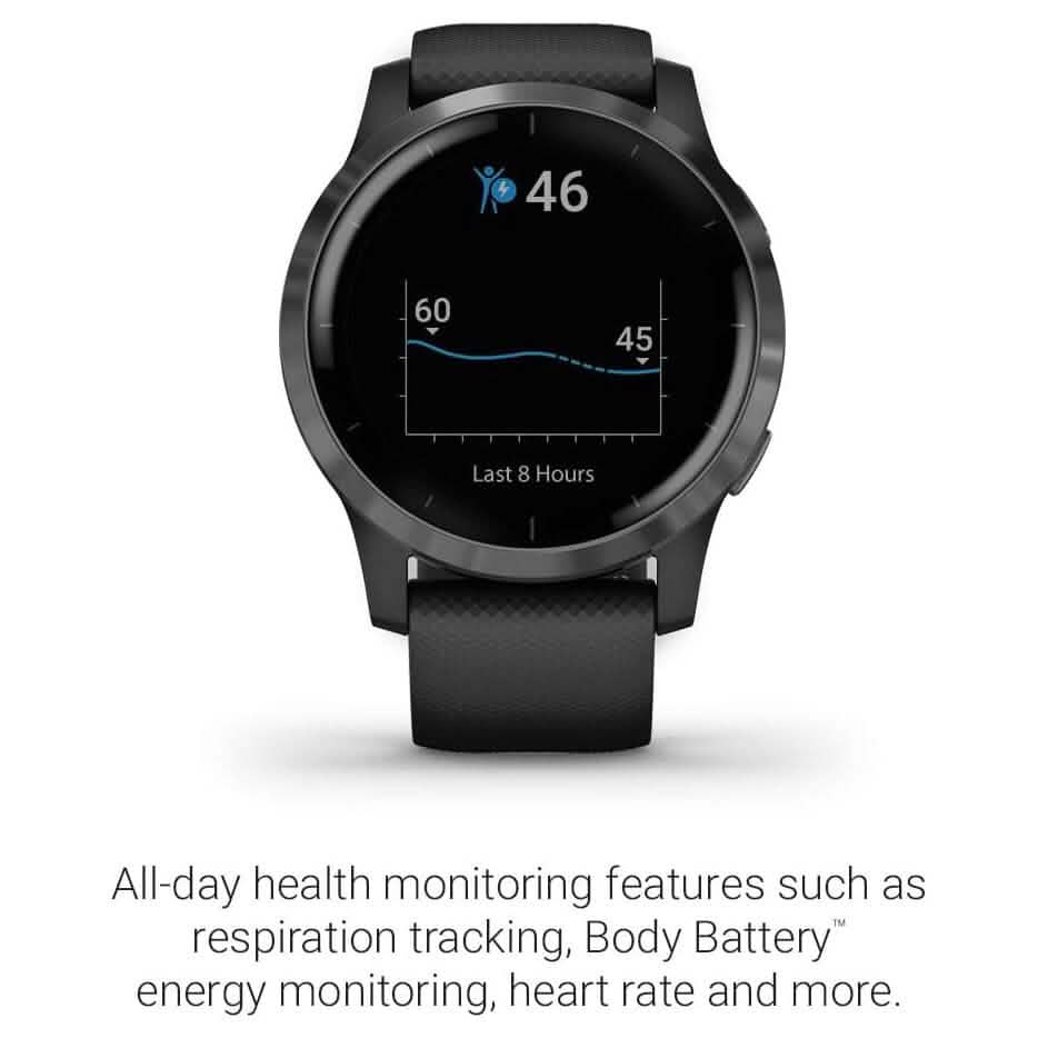 Tune in to your body, and tone up with the 45mm Vivoactive 4 GPS smartwatch. It has the broadest available range of all-day health monitoring features, music storage and on screen, animated workouts to help you reach your goals. Boost every activity by downloading your favorite Spotify or Deezer playlists (may require a premium subscription with a third party music provider) straight to your watch.