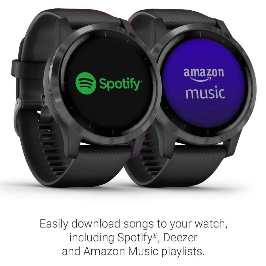 - Easily download songs to your watch, including playlists from Spotify, Amazon music or Deezer (may require a premium subscription with a third party music provider), and connect with headphones (sold separately) for phone free listening.