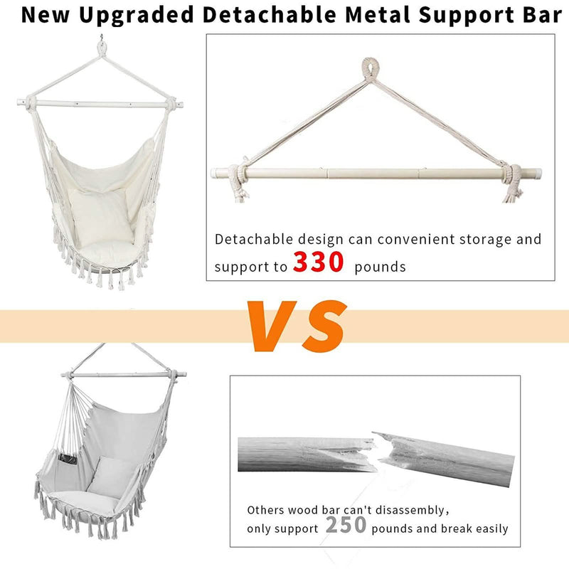 - Upgraded Detachable Metal Support Bar: The new hanging chair uses detachable metal steel support bar with 3 assembled easily sections, it can hold up to 330 lbs weight. The 39 inch metal bar not only has 2 anti-slip rings, which can fix the sling at both ends and prevent slipping but there are 22 hanging ropes on both sides of the hammock chairs that can ensure balance and safe sitting when swinging.