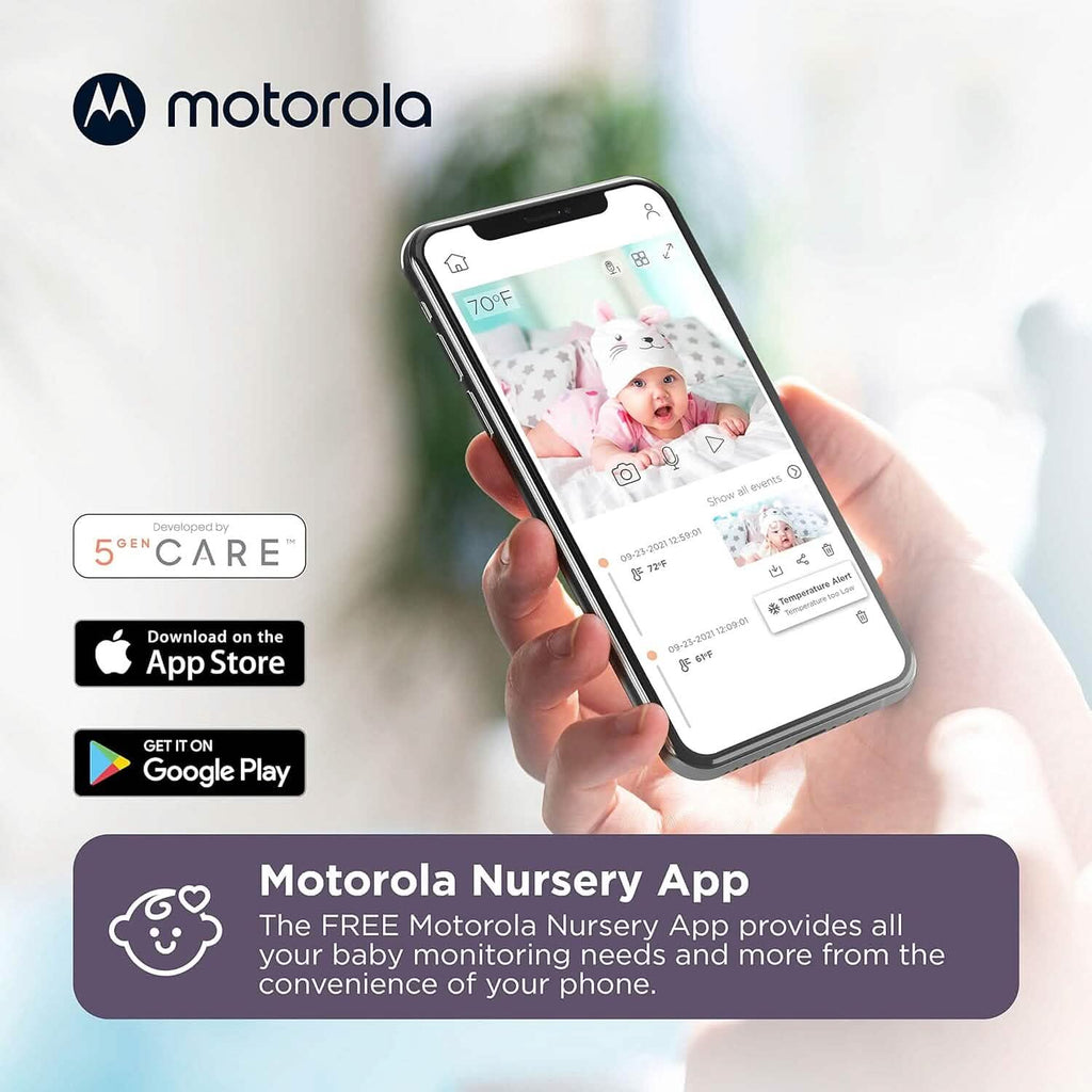 - Nursery App - Our baby camera monitor with phone access connects to our complimentary Motorola Nursery App and is compatible with Apple iOS and Android. Securely access features including two-way talk, lullaby selection, room temperature sensor and more.