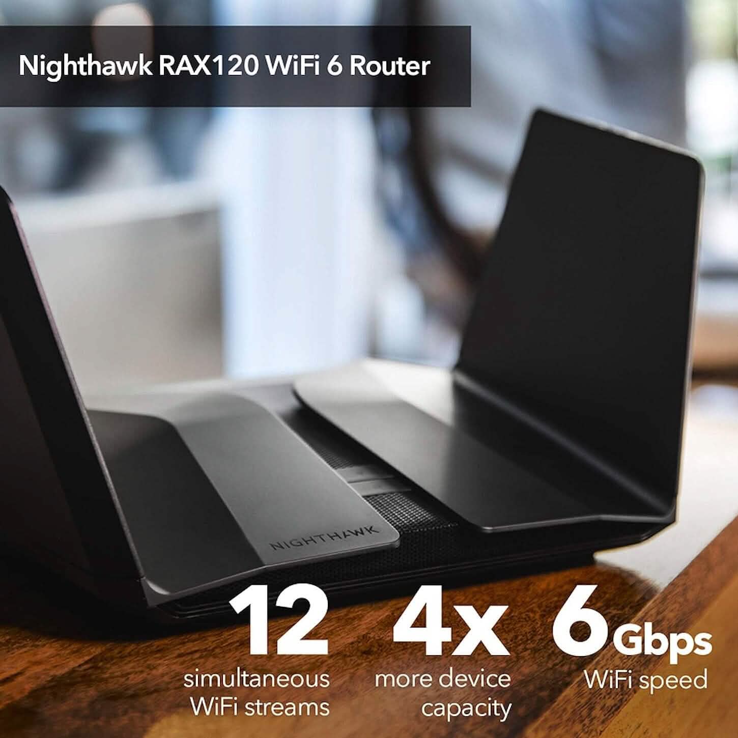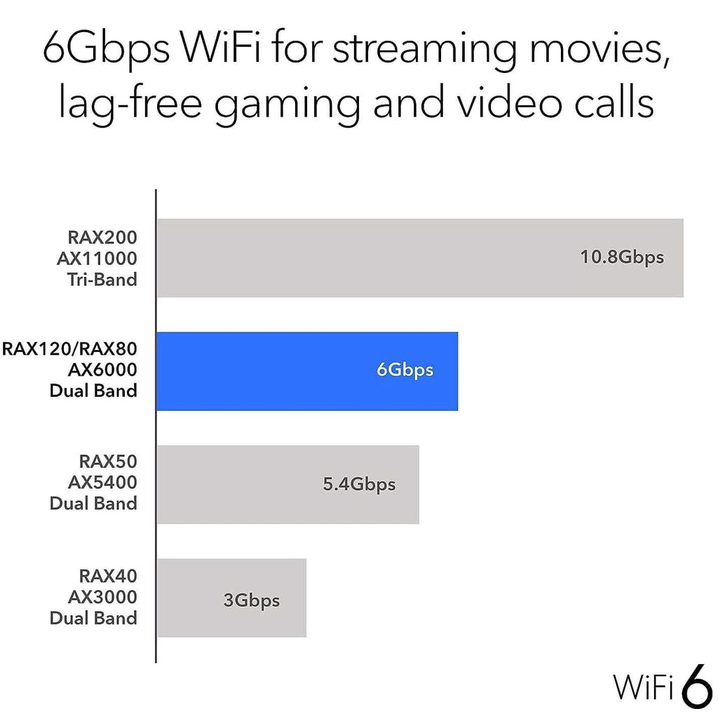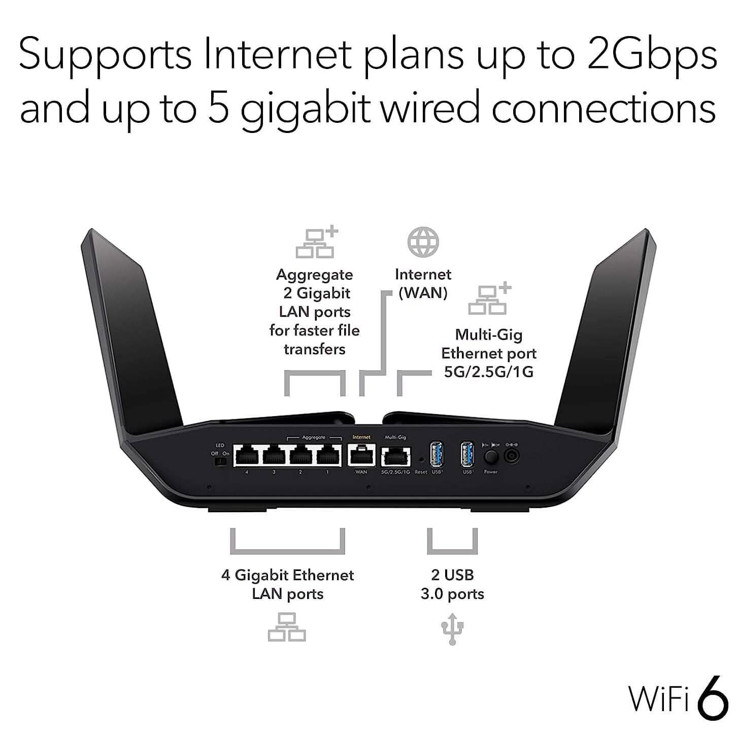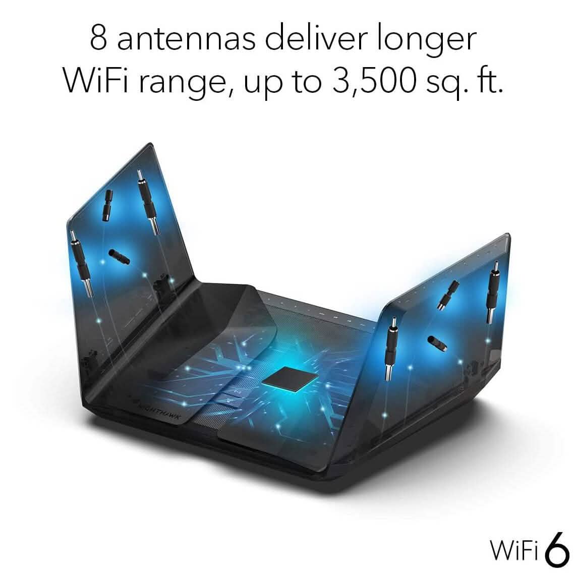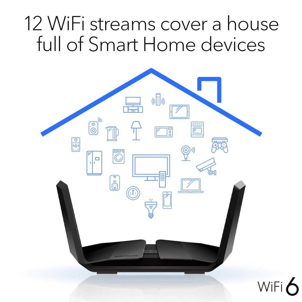 Nighthawk AX6000 12-stream Wi-Fi router is powered by the industry's latest Wi-Fi 6 (802.11ax) standard with 4 times increased data capacity to handle today's and tomorrow's growing home network. Blazing-fast combined Wi-Fi speeds up to 6Gbps and ax optimized 64 bit 2.2GHz quad-core processor powers Smart home applications, ultra-smooth 4K UHD streaming, online gaming, and more. Ax Wi-Fi features orthogonal frequency-division multiple access (of DMA) that dramatically increases network capacity. Plus, eight high-performance antennas on the router amplify Wi-Fi signals for maximized range and Reliable coverage. Nighthawk AX6000 12-stream router is also the first home router to have a 5G Multi-Gig port.