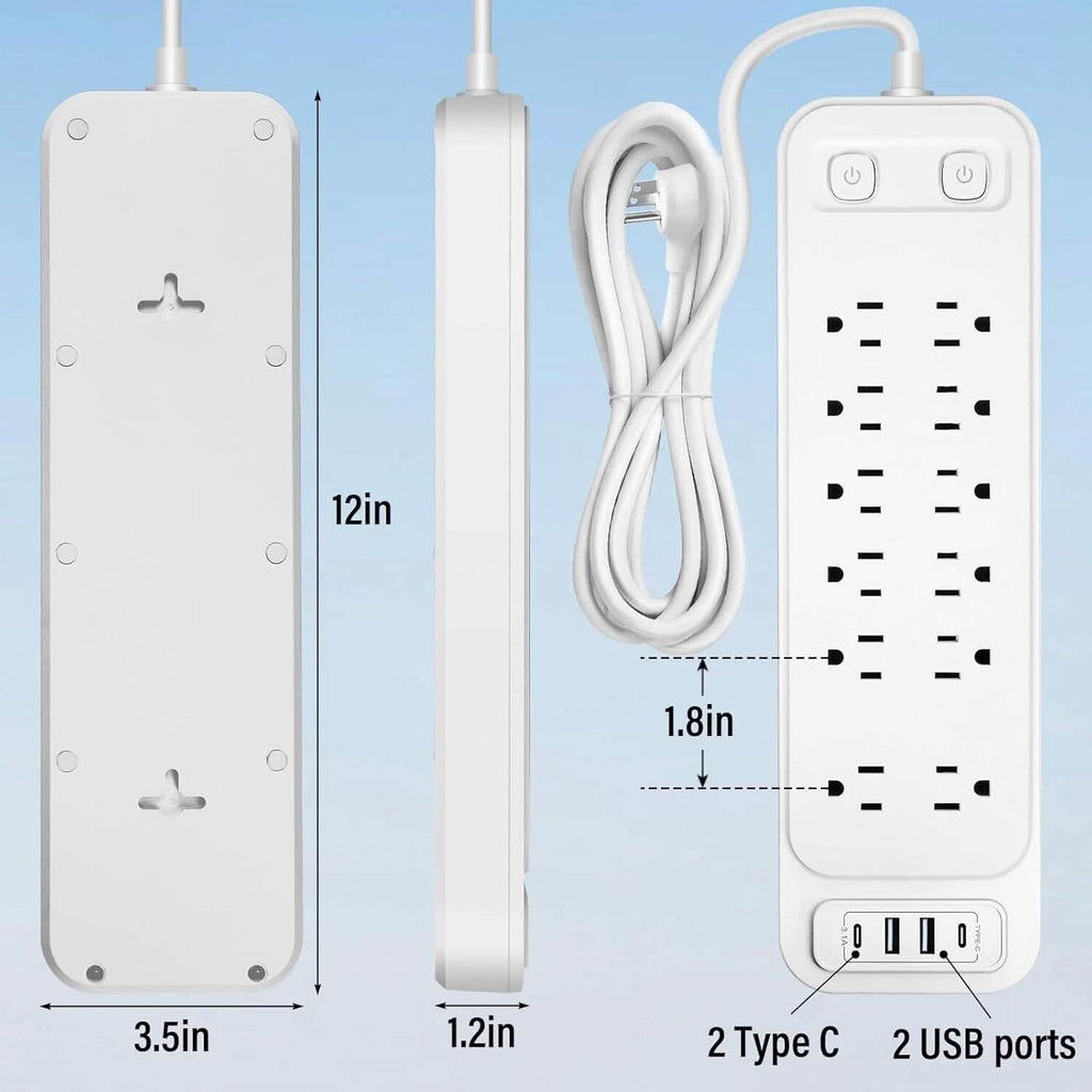 - 12 Outlets Power Strip with 4 USB Ports: The power strips with 12AC widely outlets and 4 USB charging ports and two independent switches, each USB port features 5V/3.1A Max output, can power up to 12 devices simultaneously. Wide range voltage design, can be used on 110v to 125v circuit.