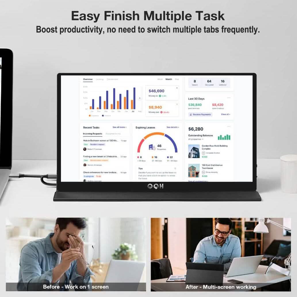 - Super Lightweight on the Go: QQH portable travel monitor for laptop, with the 1.5 lb lightest design. 0.3-inch ultra-slim thickness, can easily hold it on the street or slip into your handbag. It is better to help you do work efficiently. Loved by many travel enthusiasts and white-collar workers who usually go out to work, best partner.