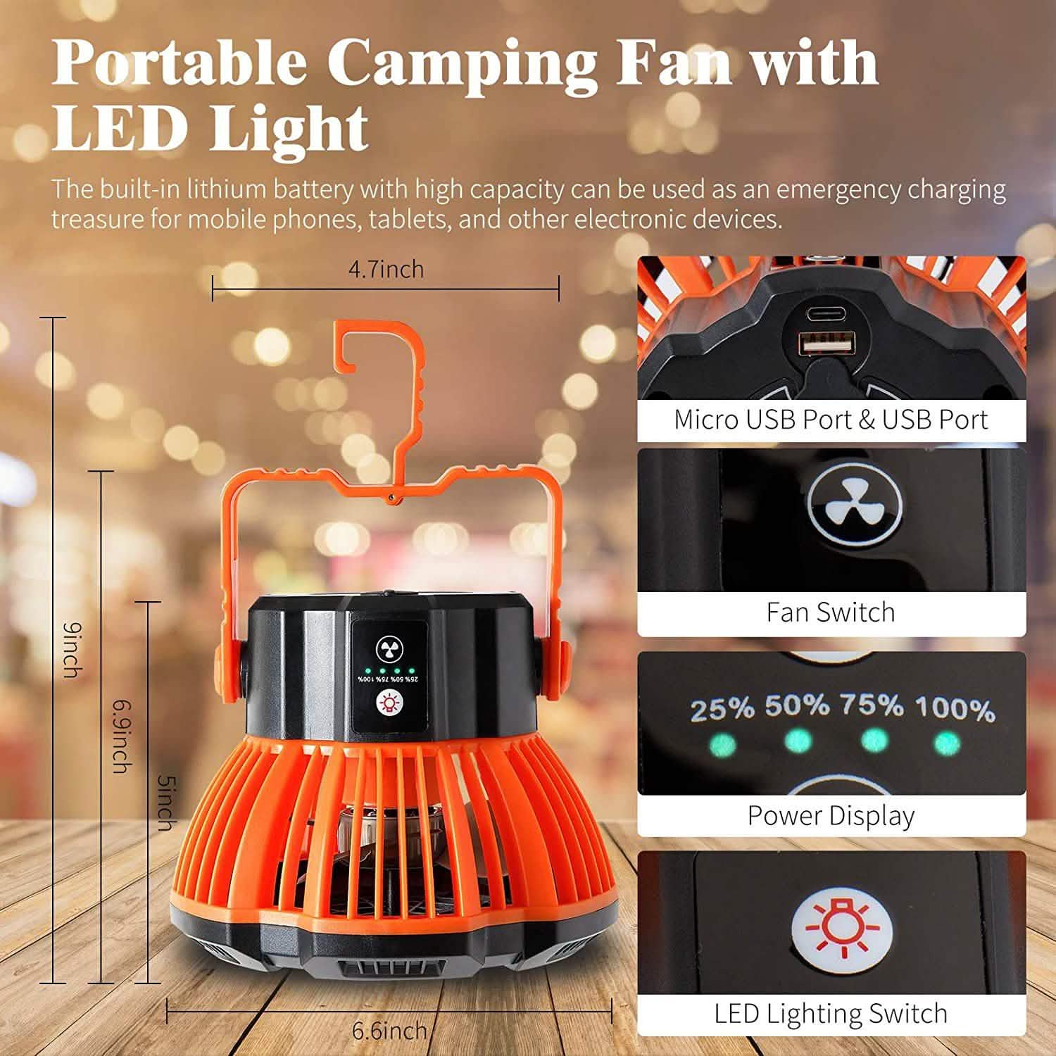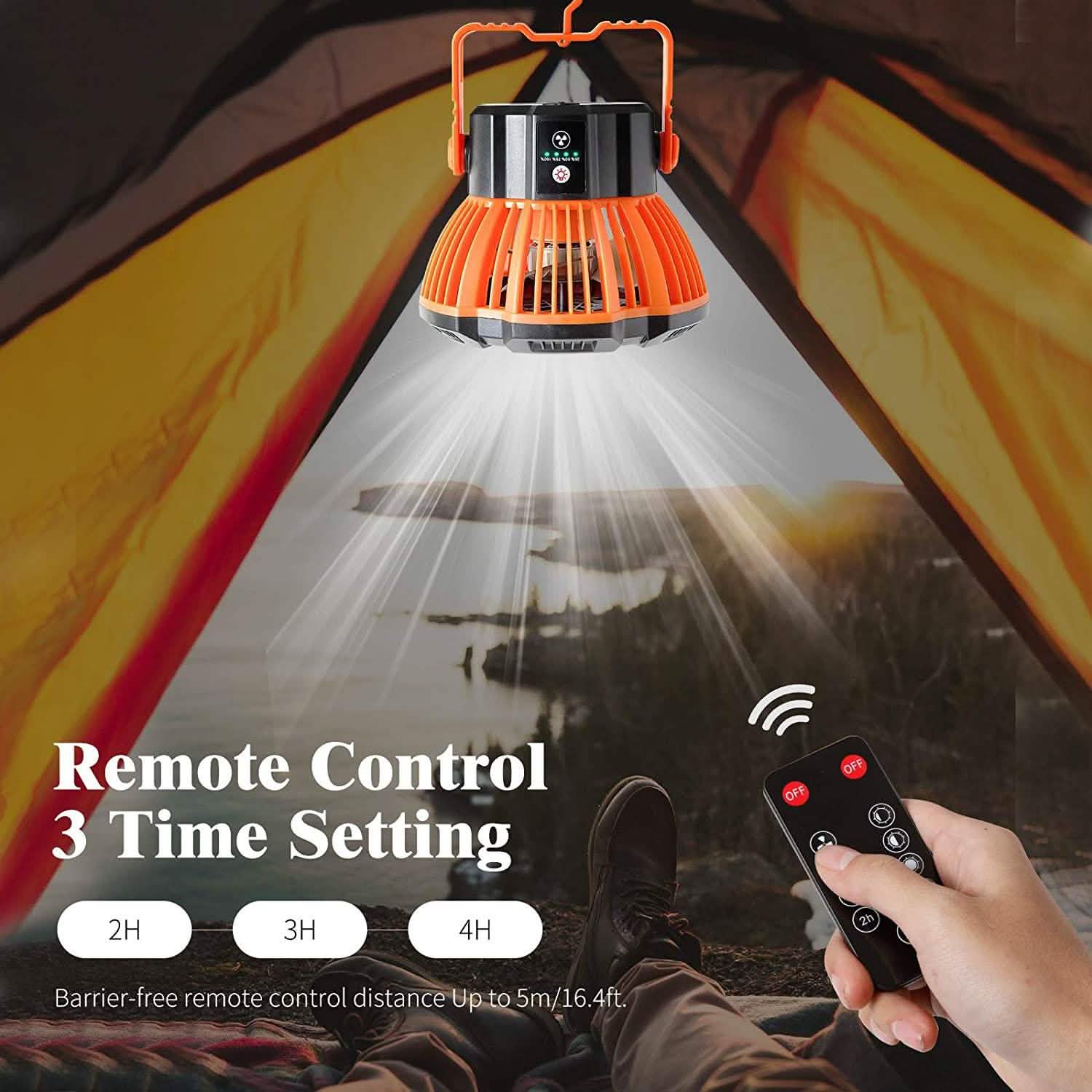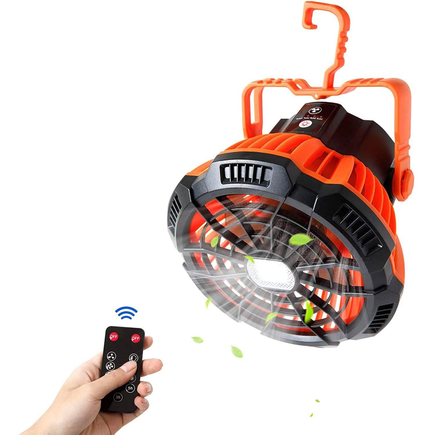 - 2021 New Design-camping Fan With IR Remote: Our upgraded portable camping fan is equipped with a remote control. You can operate the fan by the remote control, and use it for timer setting/air volume adjustment/light adjustment. The camping fan can be timed to 2, 3, 5 hours as you need, if you set the time before going to bed, you can save extra electricity bills.