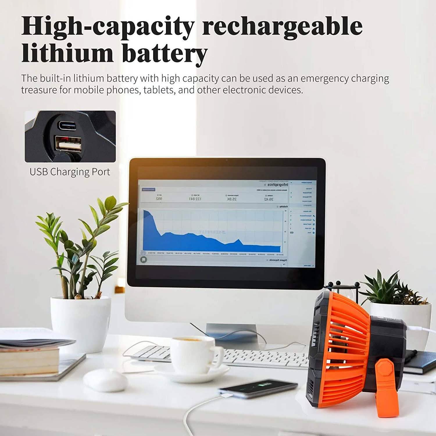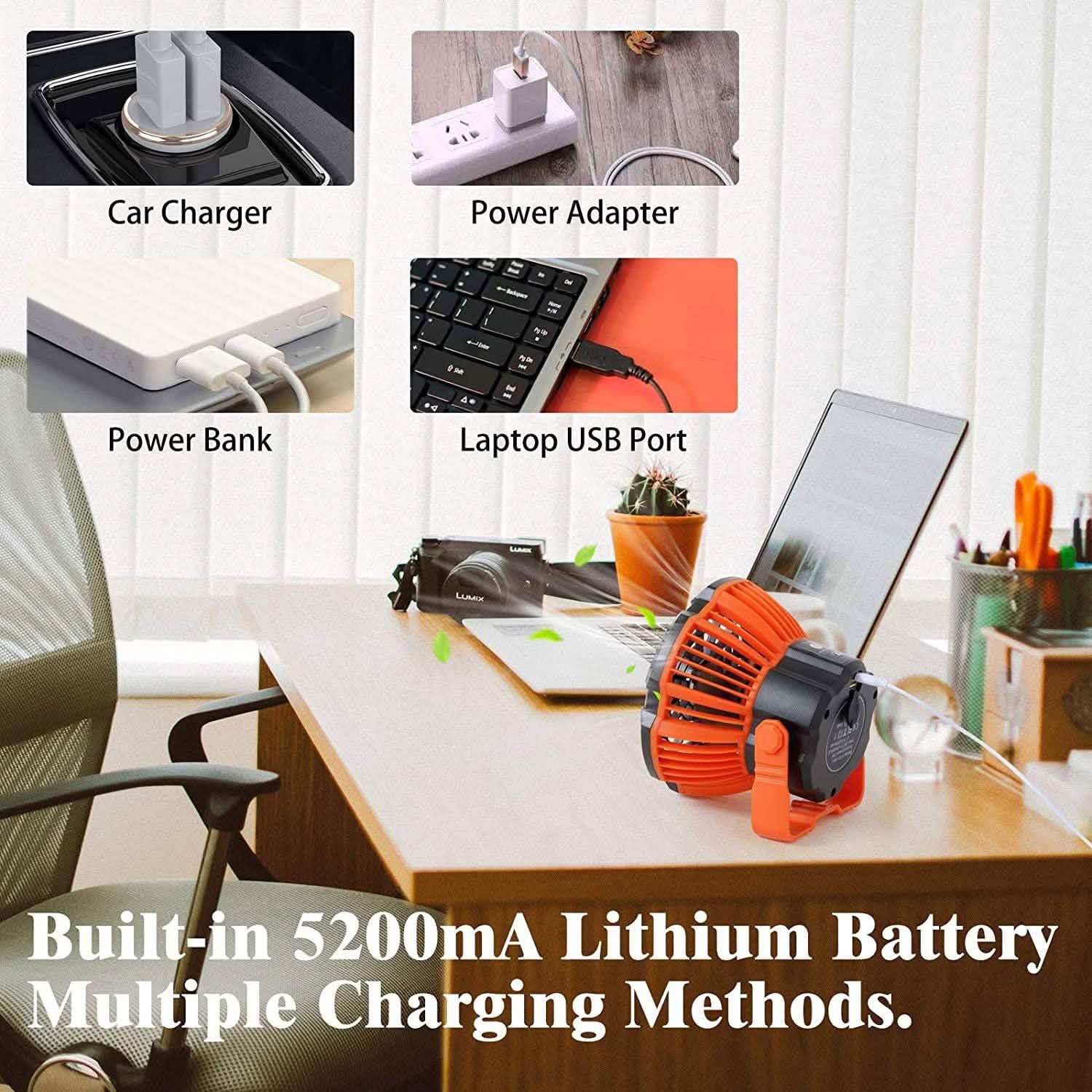 - Rechargeable & Super Long Battery Life: This travel camping fan runs on a rechargeable built-in 5200mAh battery that can be charged with a USB cable (included) via a laptop, car charger, power bank, etc. Meanwhile, it can be used to charge your phone in an emergency.