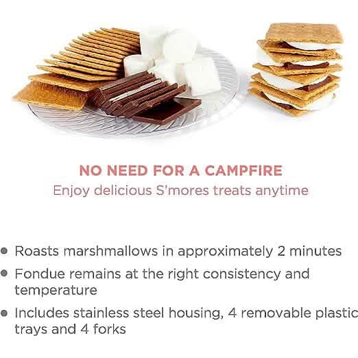 - Complete Set for Ultimate S'mores and Fondue Fun - Marshmallow Forks, Removable Trays, and Stainless Steel Housing! Get everything you need for unforgettable s'mores and fondue moments. Our S'mores Maker includes four marshmallow forks for easy roasting, four removable plastic trays for convenient cleanup, and a sleek stainless steel housing that adds style to your gatherings.