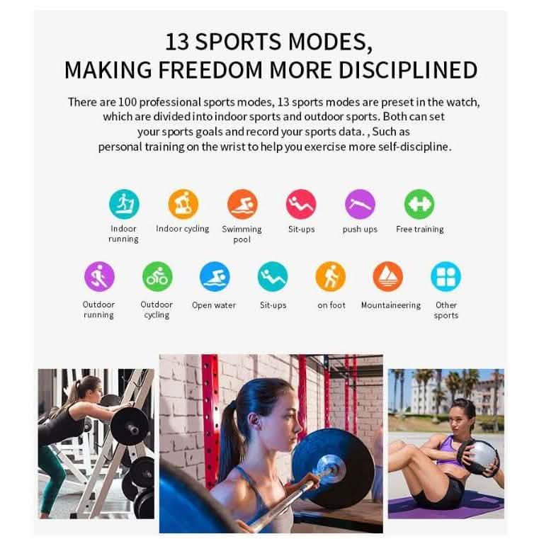 - 13 Sports Modes: Making Freedom More Disciplined: There are 100 Professional sports modes,13 sports modes are preset in the watch, which are divided into indoor sports and outdoor sports. Both can set your sports goals and record your sports date. Such as personal training on the wrist to help you exercise more self-discipline.