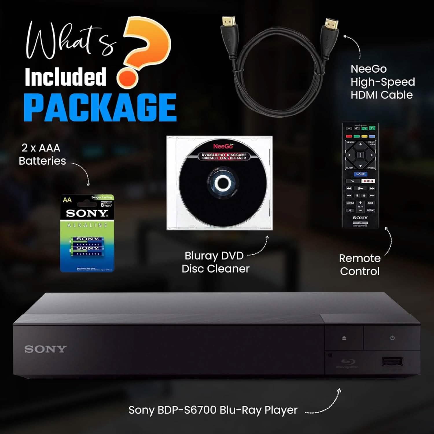 - Package Includes: Sony BDP-S6700 4K Upscaling Blu-Ray Player, Remote Control, 2 x AAA Batteries, NeeGo High-Speed HDMI Cable, NeeGo Lens Cleaner