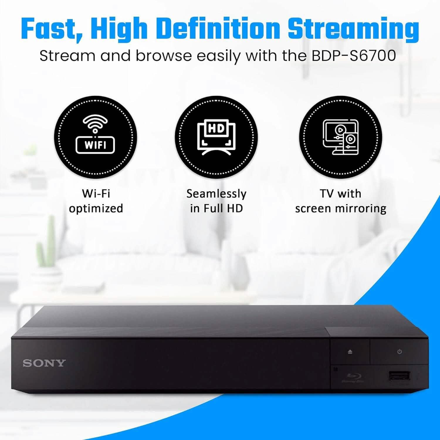 The ultimate in wireless streaming! Experience advanced picture enhancement and wireless streaming with the BDP-S6700 Blu-ray player. Enjoy your favorite movies upscaled to near 4K quality and connect wirelessly to Sony headphones, sound bars, speakers and more. What's more, with multi-room you can play CDs wirelessly throughout your home.